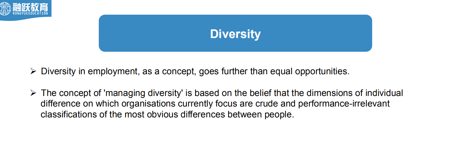 ()什么概念基于组织目前关注个人差异的维度是粗糙的与业绩无关的,组织应该反映它与客户和劳动力市场内的差异范围 A 平等机会 B文化差异 C管理多样性 课本上的讲过的概念题,自己上课注意听讲,不会了先去看看课本讲过的概念自己就会了,并且英文不知道什么意思自己查字典背单词,考试的时候不会有人在你旁边给你解释这句话什么意思的。