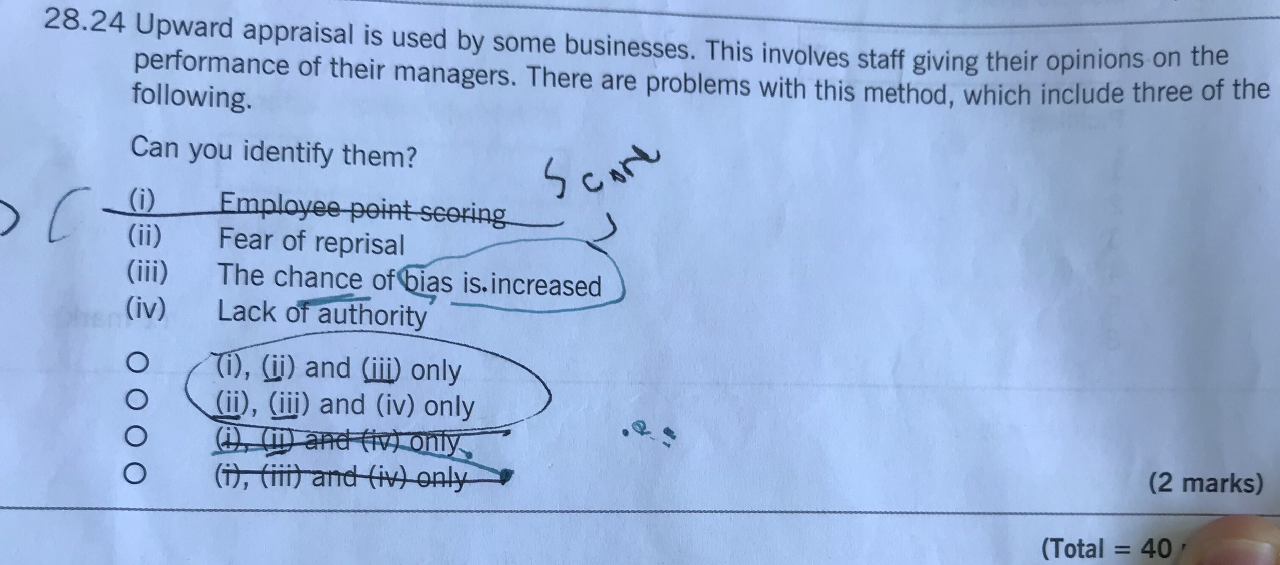 同学您好! 本题是考核“员工对上级经理打分”这一评价手段的缺点,可以很快速地判断“lack of authority”缺少授权这不是这一评价方式的缺点,因为在这种制度下员工是被赋予向上评价权的。故选A 缺点包含i (员工本身得分如何,他是否有权去给上级打分)、ii(可能存在报复性评分)、iii(存在不公正的概率提高了)