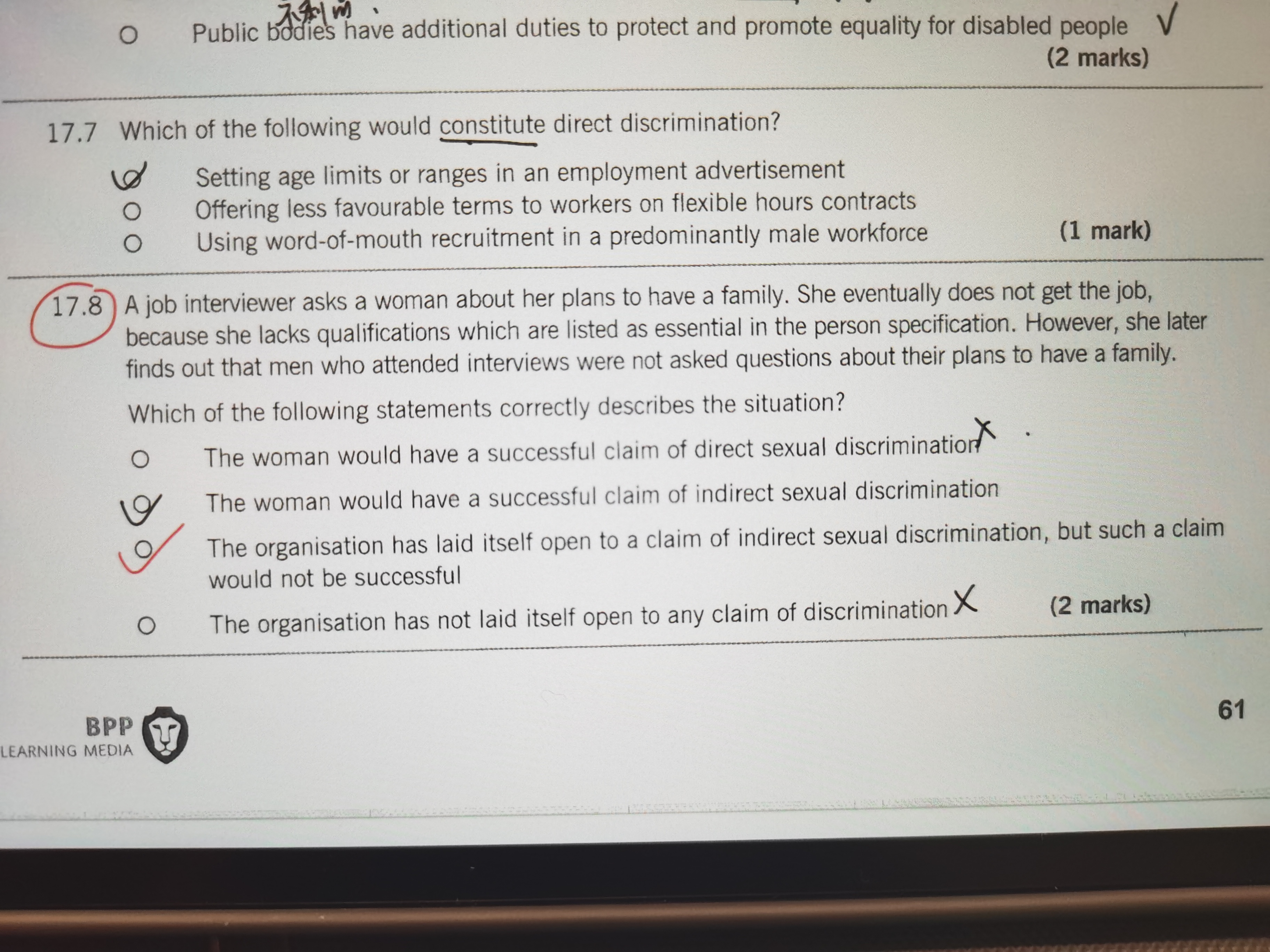 Successful claim 就是去告公司woman会胜诉 C说可以去以间接歧视告公司但是这个官司这个woman不会胜诉因为本题是因为这个woman缺少了qualification as essential 必要的能力才没雇佣 然后她被问了是否要结婚的问题只是面试中的一个小部分最终原因是她没能力,所以这个间接歧视的官司不会胜诉