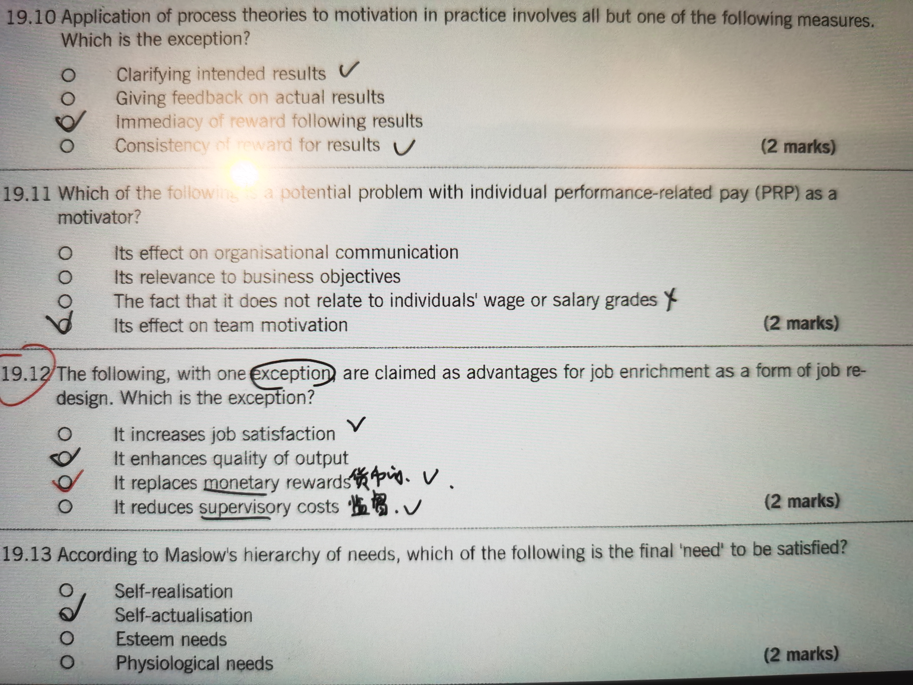 题目问的是以下,除了一个列外 被认为是作为工作重新设计为了丰富工作的好处,呢一个是例外?A增加了工作的满意度 B提高了产出的质量(工作更加多丰富了,工作产出质量会提高)C替代了货币奖励 一般我们增加了工作内容 员工会想要更多的工资奖励 所以不选 D降低了监管成本(工作更加丰富了 内容多了以前10个工作内容需要1个人监管 现在丰富后20个工作内容需要一个人监管 所以监管成本会降低)