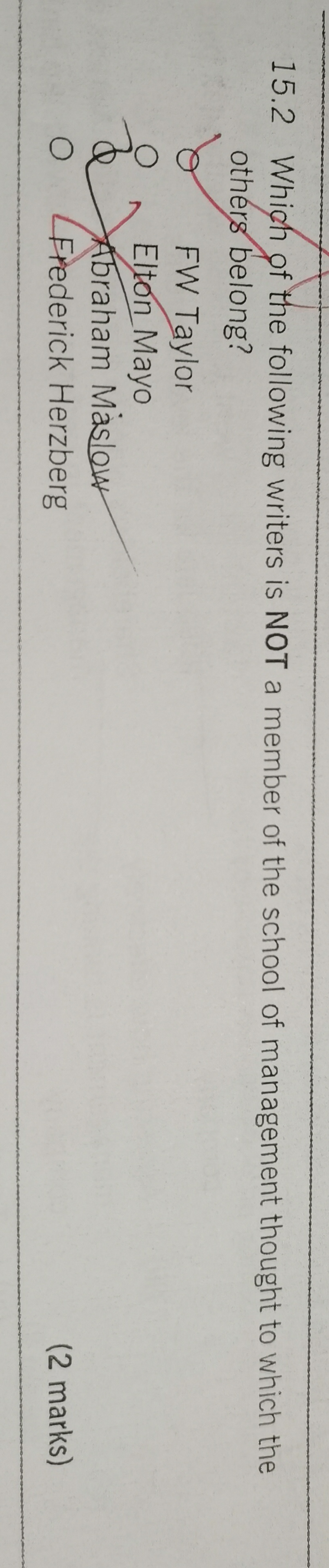 首先,题目中的school of management,其实是省略了"human"这个词,他真正想问的是“下列哪位作者不属于human school of management”学派。 A选项中的Taylor提出的是scientific management theory(科学管理理论),强调的是科学管理,而没有说怎样激励人,或者人文关怀一类的。 B选项的Mayo提出了human relations school of thought,是典型的human relation school,从“school”这个词也可以明显看出他是符合题意的。 C和D选项的Maslow和Herzberg都是motivation theory这块的知识点。这两位提出的理论都是在强调“人”的因素,Maslow提出需求层次论,强调人的五大需求;Herzberg提出保健因素和真正激励因素,也是在强调如何调动组织中的“人”工作的积极性。 所以只有A选项的这位作家不符合题意。