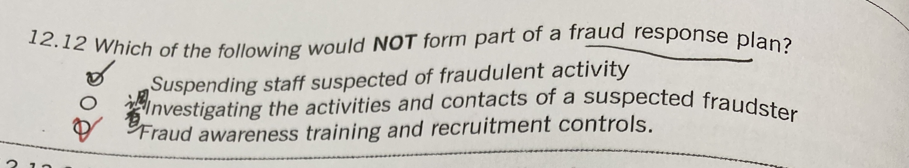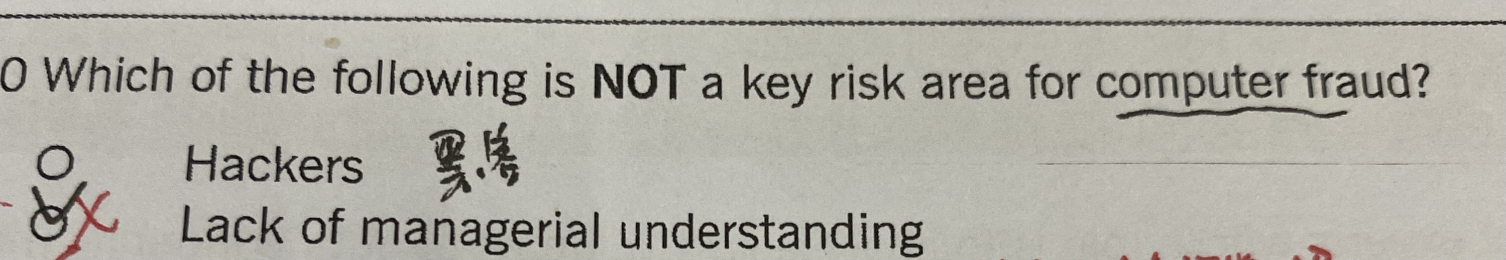 12.2:看是否可能发生舞弊情况,主要是判断此情况是否与“人”和“钱”都相关。比如(ii)这个选项,表面上看,“准备发货单”与钱无关,但实际上准备发货单的人可能会和顾客串通,故意多发或者少发货物,以此来得到一笔灰色收入。(iv)也是同理,在制定预算和绩效目标的时候,制定者可能会虚报,这也会产生舞弊问题。 图二:因为题目问的是computer error(电脑系统漏洞),而第二个选项“缺乏对管理的理解”是人为控制不足,属于human risk or error,不是系统漏洞。 12.12 这道题说“fraud response”,既然是应对舞弊,说明舞弊已经确确实实发生了,我们要进行补救,而C选项是舞弊发生前的预防措施。这道题的关键是要分清哪些措施是舞弊发生前做的,哪些是舞弊发生后做的。