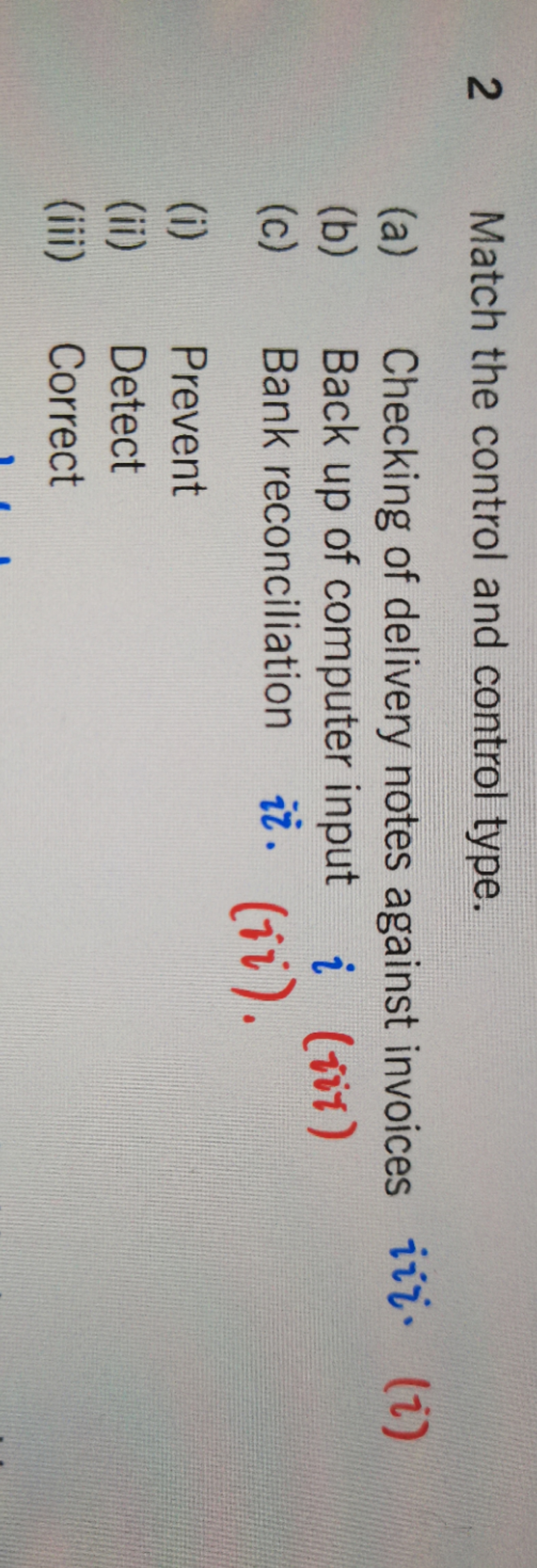 a)核对发货单和发票是否对应,是为了防止员工的舞弊行为,比如把货发出去了,却没有开发票。所以是prevent。注意是核对发货单和发票,如果是只检查其中之一,可以选“correct”,但二者一起检查,目的是“prevent fraud”。 (b)看到computer这个词,一定要马上想到“输入电脑的数字是否正确”,因为电脑系统是很精确的,基本上只要输入的数字correct,就能自动起到prevent和detect的效果了 (c)bank reconciliation叫银行对账单,是指银行和企业核对账务的联系单,也是证实企业业务往来的纪录,也可以作为企业资金流动的依据。也就是说,要先有业务往来,然后才能查对账单,所以主要目的是交易后进行检查和对账,选detect