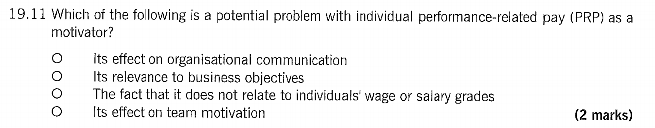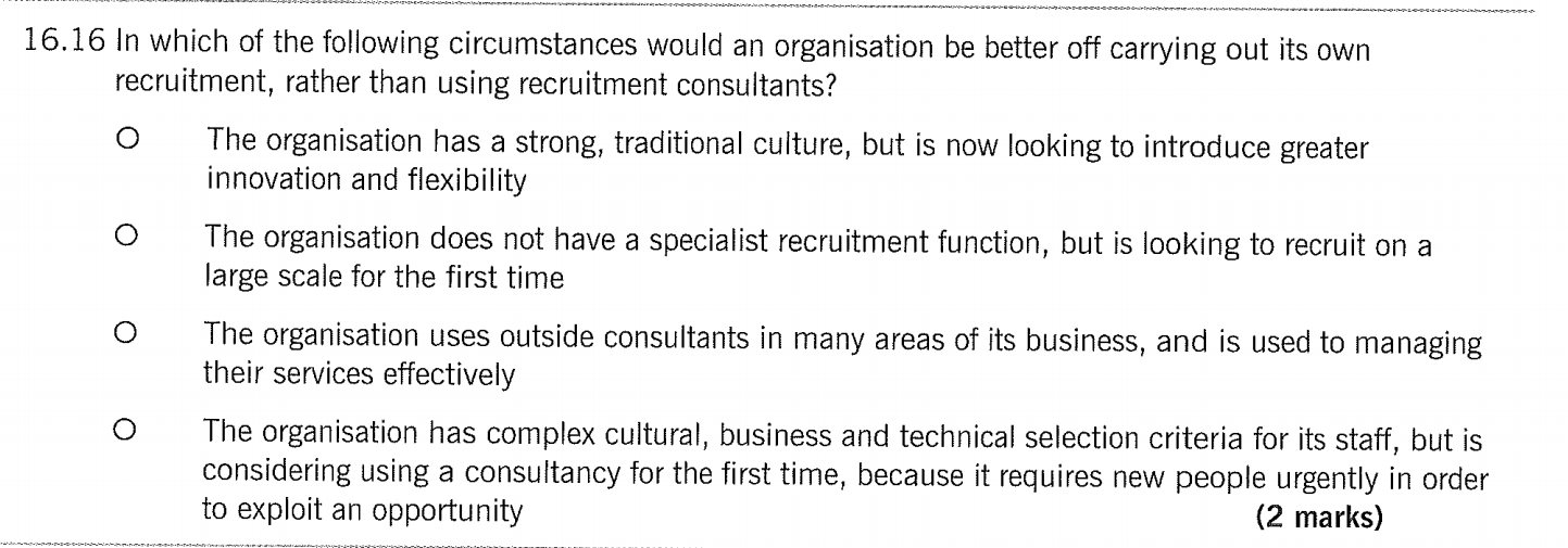 1、这道题让我们在“自己招聘”和“请外部人员帮我们招聘”(也就是所谓的猎头、中介等)之间作比较,找出选择自己招聘的公司。A选项:首先这个公司是strong and traditional,言下之意就是它足够强大,平常都自己做招聘。但是后半句话说了,这个公司正在“looking to introduce greater innovation and flexibility”,说明这个公司现在想要引入新鲜血液了,他们在寻求改变,那么就很有可能从自己招聘,转变为请外部人员帮我们招聘。 B选项说这个公司没有自己的招聘职能部门,能力不足,那只好找猎头公司了。 C选项的关键词是"is used to"(习惯于),既然都习惯于请外部人员帮忙招聘了,那C选项肯定也不能选。 D选项的关键词是"first time"和"urgently",这个公司急招人,但它以前又没有用过猎头公司,猎头对本公司的业务压根就不熟悉,光是让猎头了解本公司就要花费大量时间了,不符合urgent这一需求。 2、这道题问PRP(即绩效工资)的潜在问题(即缺点)。绩效工资的最大缺点就是影响积极性,因为员工可能为了完成绩效的任务而工作,忽略了工作本身的目的和要求。比如绩效规定销售人员这个月要给100个人打电话进行推销,从表面上看,某个员工确实打满了100通电话,但是这100通电话里可能有20通都是打给自己家人的,而家人从一开始就没打算买我们公司的产品,说明这20%的绩效都是有水分的,是为了完成绩效而完成绩效。至于ABC三个选项,都是PRP的优点。