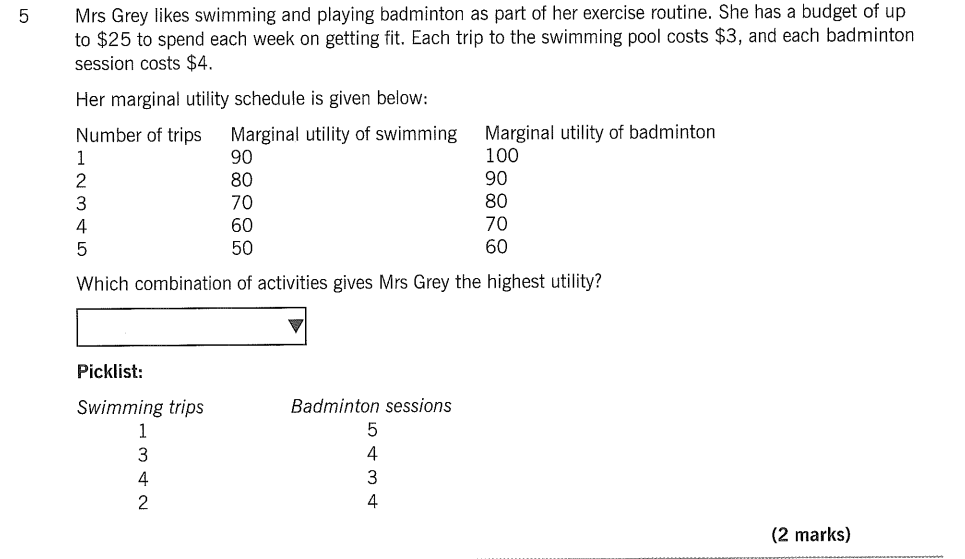 边际效用指的是:额外消费一单位商品所获得的满足感,或少消费一单位商品所放弃的满足感。我们怎么去找这个“边”,意思就是在游泳和羽毛球这两者之间找到一个“平衡点”,让游泳和羽毛球的满足感是一样的,任何一方多一点或少一点就会打破平衡。那我们可以用方程式来计算。设游泳的总边际效应为X,羽毛球的为Y。那么需要满足的方程式有:①x>y(因为同等次数时游泳的边际效应<羽毛球的,所以想要平衡,就要游泳次数多一点,羽毛球次数少一点);②X/3=Y/4(单次的满足感是相同的)。从给出的表格里不难看出,X应该=60,Y=80,即应该游泳4次,羽毛球3次。再看一下花费,4trips×$3+3trips×$4=24,没有超过限定的$25,所以最终答案就是游泳4次,羽毛球3次。