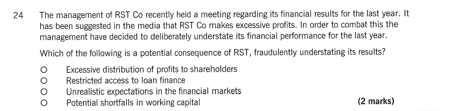 这道题说公司故意把利润报低了。我们直接来看选项:A说给股东分配额外的利润,都已经报低了,潜台词就是“我们公司没赚到钱,我们可穷了”,那哪还有利润可以分呢?所以A是不对的。 B说融资渠道受限,这个是对的,因为profit=sales-cost,利润偏低说明公司要么是sales偏低,东西卖不出去;要么是cost偏高。那投资人一看,这公司东西卖不出去,还乱花钱,那他肯定会觉得投资这家公司的风险太大了,搞不好自己投了一大把钱进去,啥利润都没捞着,算了算了,不投这家公司了。所以报低利润一定程度上会影响融资的。 C说金融市场的不切实际的期望,利润都这么低了,还在幻想那些不切实际的,这就好比普通打工人说想和马云一样挣一个亿,听着就像在做梦嘛。C应该是报高利润产生的影响。 D说潜在的资金短缺,这个也不对,潜在资金短缺的意思是:公司开了一个新项目,或者扩大了公司的规模,此时我们需要大量的资金来做前期的准备和运营。可是公司报低了利润,意味着不仅不会开新项目,甚至可能要缩减原有的项目。