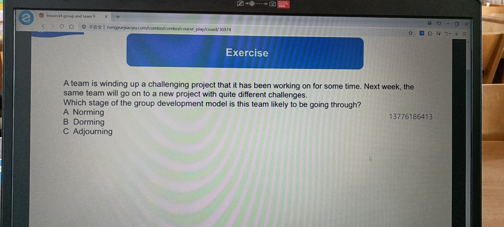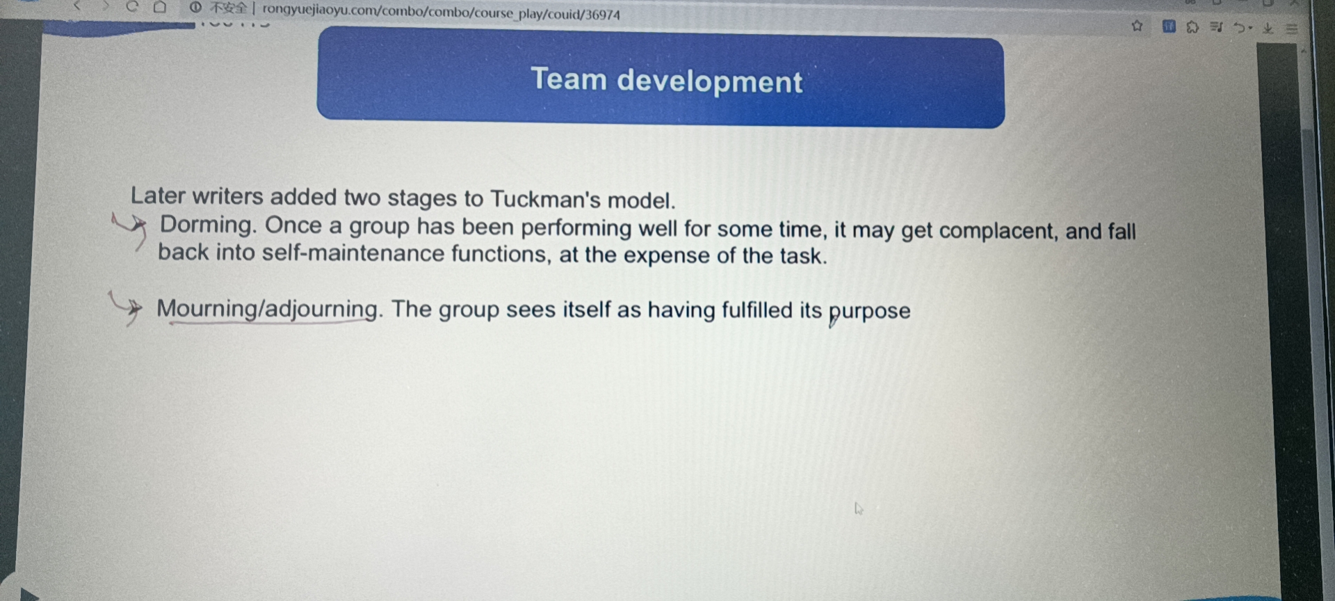 1. Dorming 的意思是这个团队取得了一些成就后,里面的成员骄傲了,可能会做出一些危害团队是事情,使团队解散; 2. Mourning/adjourning 的意思是团队制定的目标已经完成了,这个时候就会有两个选择,团队解散或者再制定一个新的目标; 例题考察的就是这两个概念的区分,题目描述的意思是这个项目完成后又开始了一个新的项目,这就符合Mourning/adjourning的意思, 老师建议你在进行记忆的时候,Mourning和adjourning都要记住,本题使用的adjourning,有时候也会用Mourning进行提问。