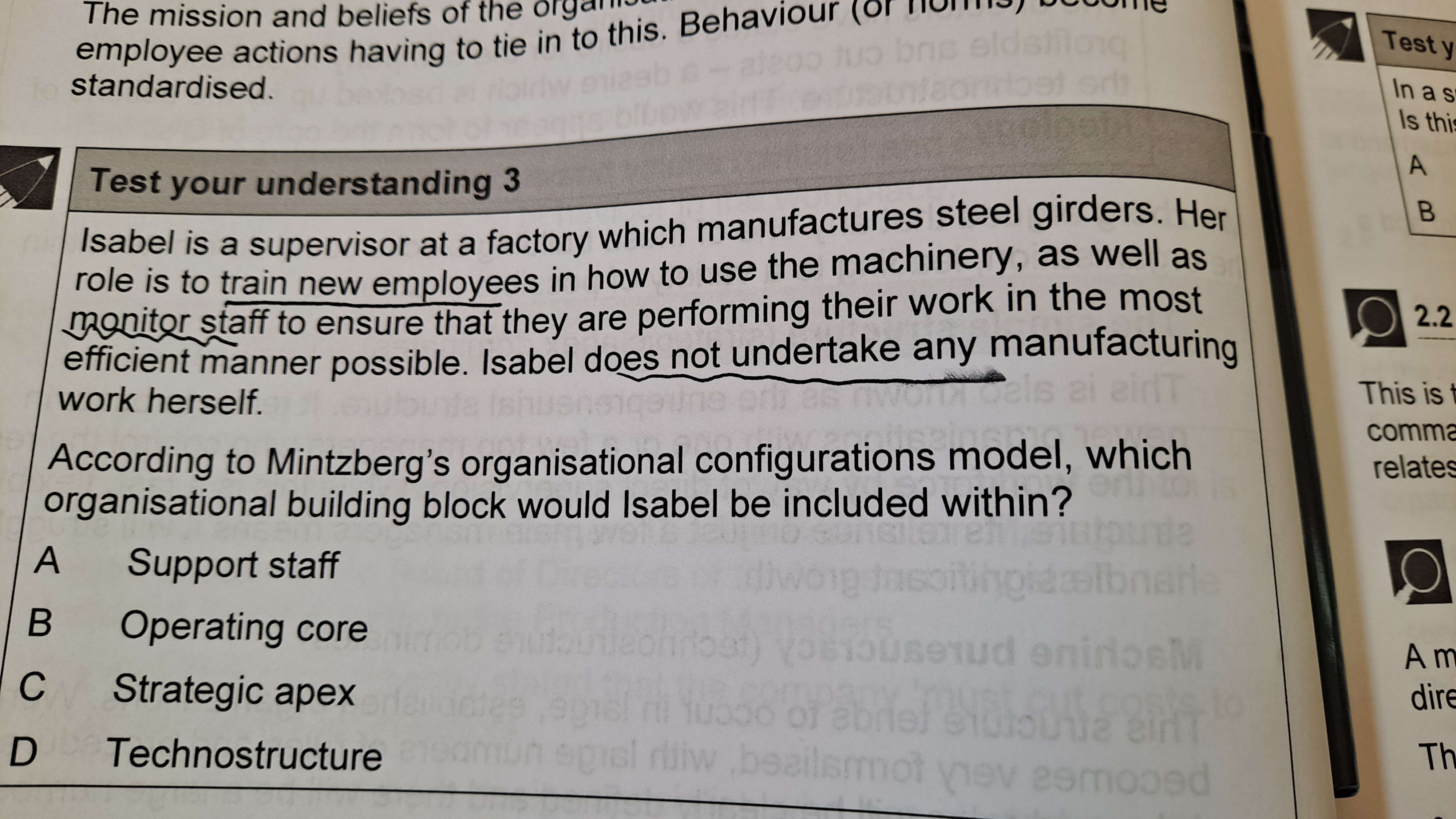 题目的意思是,这个员工负责培训和指导员工怎么操作和监督员工工作,但她自己并不直接参与操作。所以可以直接排除B和A(A指的是服务员工,比如清洁工,餐厅员工等);从她监督来看,她只是一名基层员工负责人,并不是公司战略层,所以排除C选项,D选项你可以看一下28页的具体描述:...plan and control the work of others,符合题意。 同学,今后题目如果没有读明白,建议先查单词理解题目描述,从F1学习的过程中慢慢提升英文阅读理解能力;如果不懂明兹伯格五块砖,先看课程相关视频,也可以回去看看这本教材的28页,讲解的很清楚。