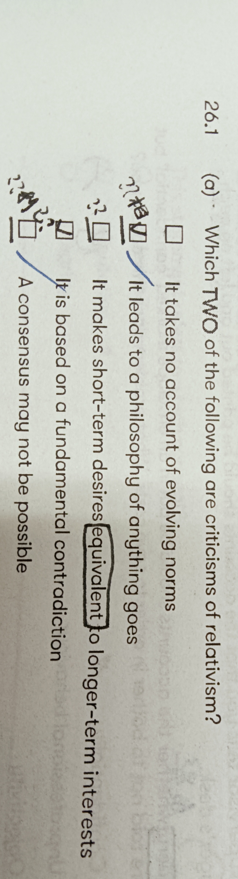 同学你好,第三个的意思是:使短期愿望等同于长期利益,这不是相对主义,这是绝对主义;第五个意思是达成共识可能是不可能的,所以也可能是可能的,是相对主义,不选择这个的原因是它是相对主义的特点,并不是缺点。 下面是bpp教材上相对主义和绝对主义的定义,这个知识点可作为了解, Relativism is the view that a wide variety of acceptable ethical beliefs and practices exist. The ethics that are most appropriate in a given situation will depend on the conditions at that time. Absolutism is the view that there is an unchanging set of ethical principles that will apply in all situations, at all times and in all societies.