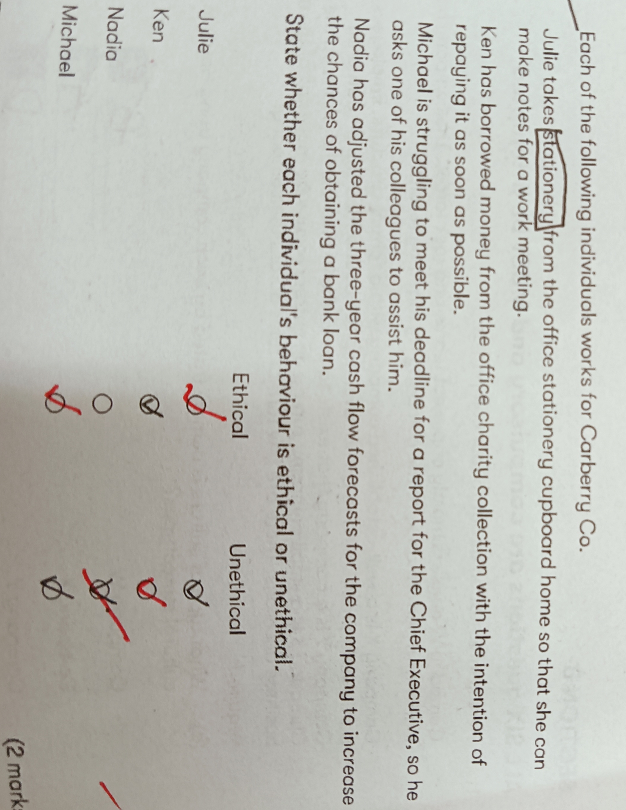 同学,第一位J..是把文具带回家用于工作,是道德的;K..是从公司借钱了,虽然他说自己会尽快还,但是你想想那些挪用公款打赏女主播的人,哪一个不是这样想的,在正常情况下,个人和公司是不能产生利益纠葛的;接着,M...,他需要同事协助工作,这是没什么问题的;最后一个人,为了获得银行的贷款,调整了公司三年的预测现金流,这是违背职业道德的。同学,这道题是案例比较长一点,老师觉得你没做好可能是因为有些单词不认识,在做题的时候就要养成及时查单词的习惯,为后来的科目打基础。同学你的bpp练习册不是最新的,老师这是最新版的练习册,下次提问请附上具体的页码和题号,继续加油!