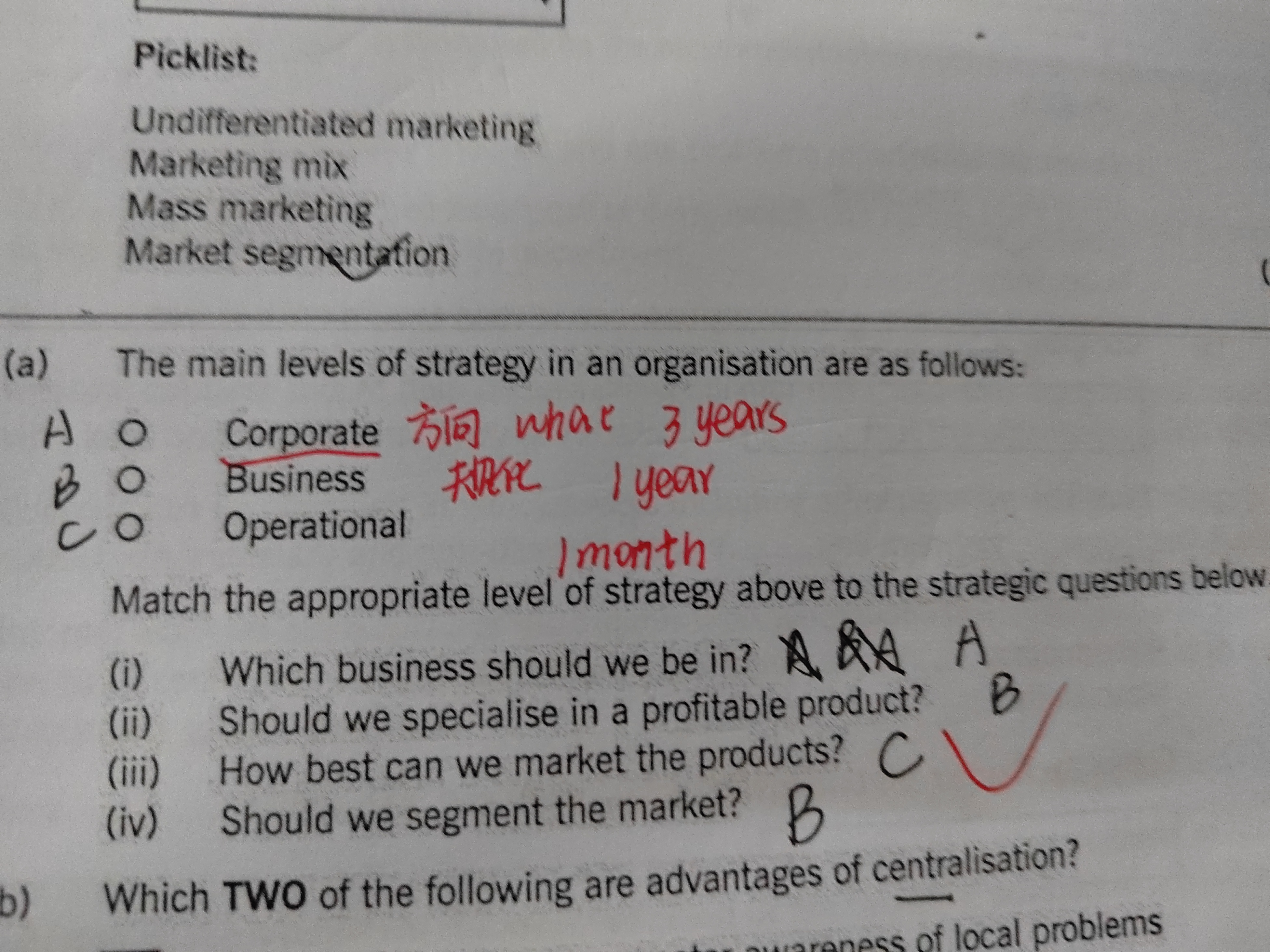 同学您好, 公司战略的层次有:总体战略(公司层战略)corporate、业务单位战略(竞争战略)business 和职能战略(职能层战略)operational 三个层次。总体战略又称公司层战略。公司层战略主要强调公司应该在哪些经营领域进行生产经营活动,即回答两个方面的问题:一是“我们应该做什么业务”,即确定企业的使命与任务、产品及市场领域(主要涉及产业、产品和市场定位);二是“我们怎么样去管理这些业务”,即在公司不同的业务单位之间如何分配资源以及采取何种成长方向等。 业务单位战略是在总体战略的指导下,一个业务单位进行竞争的战略,也称竞争战略。“业务单位”被赋予一定的战略决策权力,可以根据外部市场的状况对产品和市场进行战略规划并进行战略决策。竞争战略的目标是取得竞争优势。职能战略又称职能层战略,是指企业中的各职能部门制定的指导职能活动的战略,描述了在执行总体战略和业务单位战略的过程中,企业中的每一个职能部门所采用的方法和手段。 主要涉及企业内各职能部门,如营销、财务、生产、研发、采购、人力资源等,其主要职责是如何更好地配置企业内部资源,为各级战略服务,并提高组织效率。