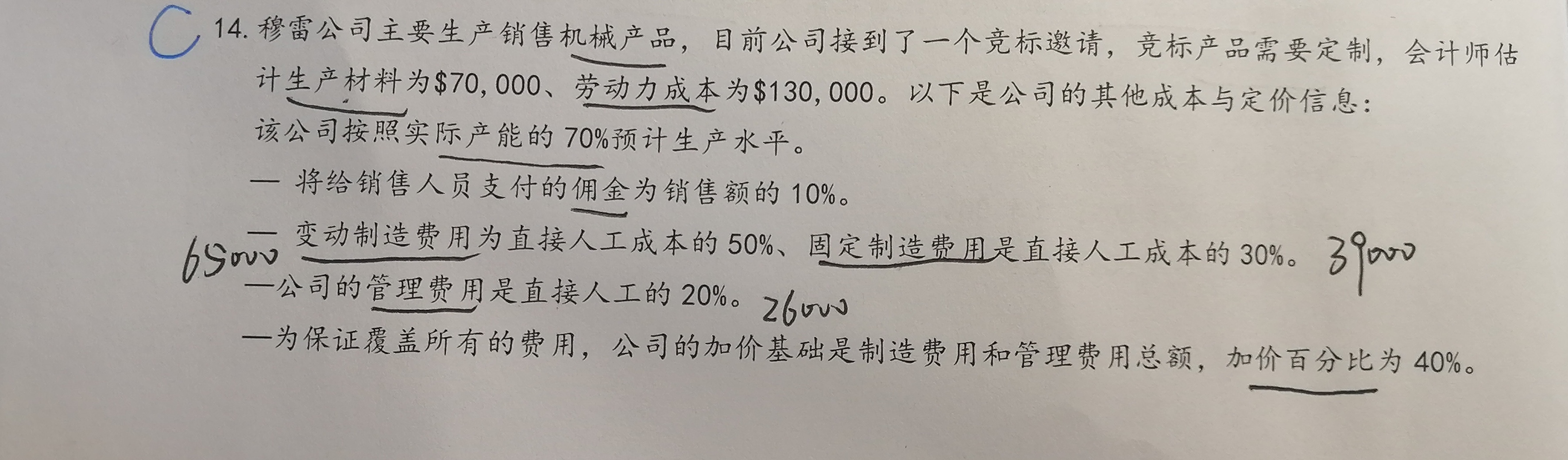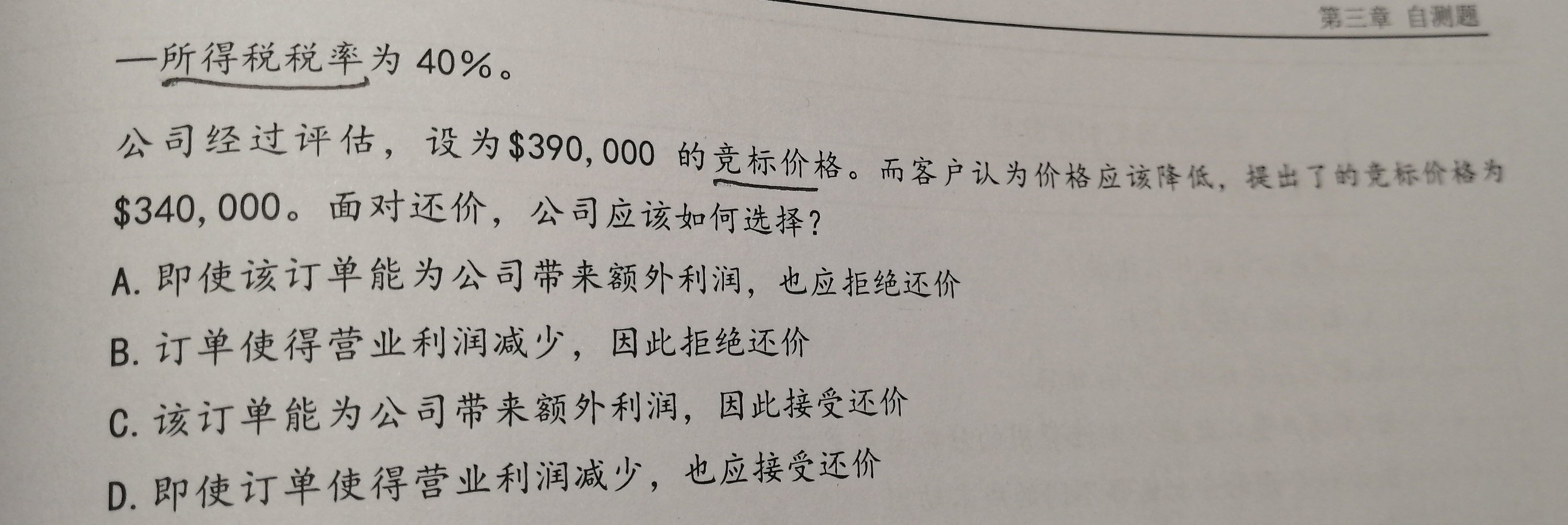 同学你好.我认为可以这样去理解.而外利润是用销售收入,扣除佣金,材料成本.变动制造费用,固定制造费用,成本加成后为而外的税前利润,再扣除所得税后,为净利润.而收入可以用34万报价来理解,看是否有额外利润.再决定是否接这个订单.