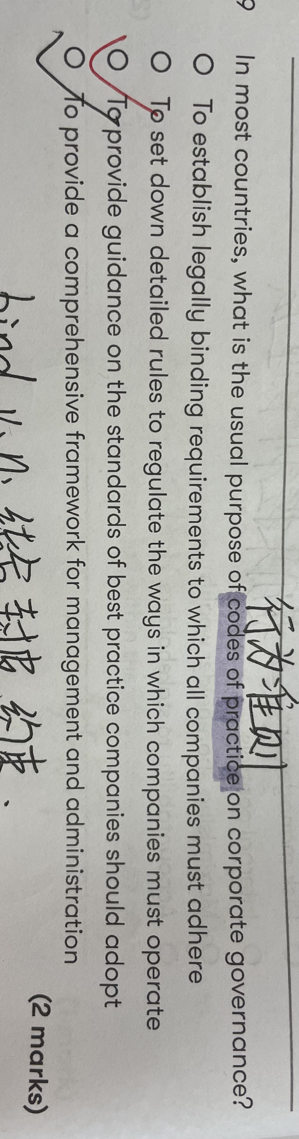 同学您好,第一个:达成所有公司都必须遵守的具有法律约束力的协议 第二个:提供详细规则,指导所有公司的运营。第三个:就公司应采用的最佳实践标准提供指导(主要的目的),第四个:为公司的管理和行政提供有意义的指导方针。这道题主要是要知道Code of practice on corporate governance没有法律效力,该准则为公司应采用的最佳公司治理结构提供指导。