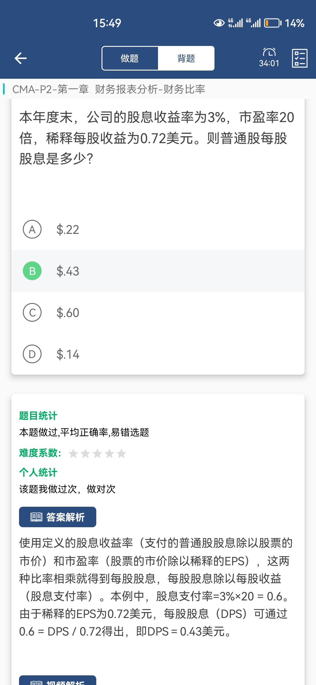 同学你好。谢谢您的提问。是的,你说的很对,市盈率应该是每股市价除以每股收益。但是EPS,每股收益,包含基本每股收益和稀释的每股收益。具体,要根据题目来决定用哪个。