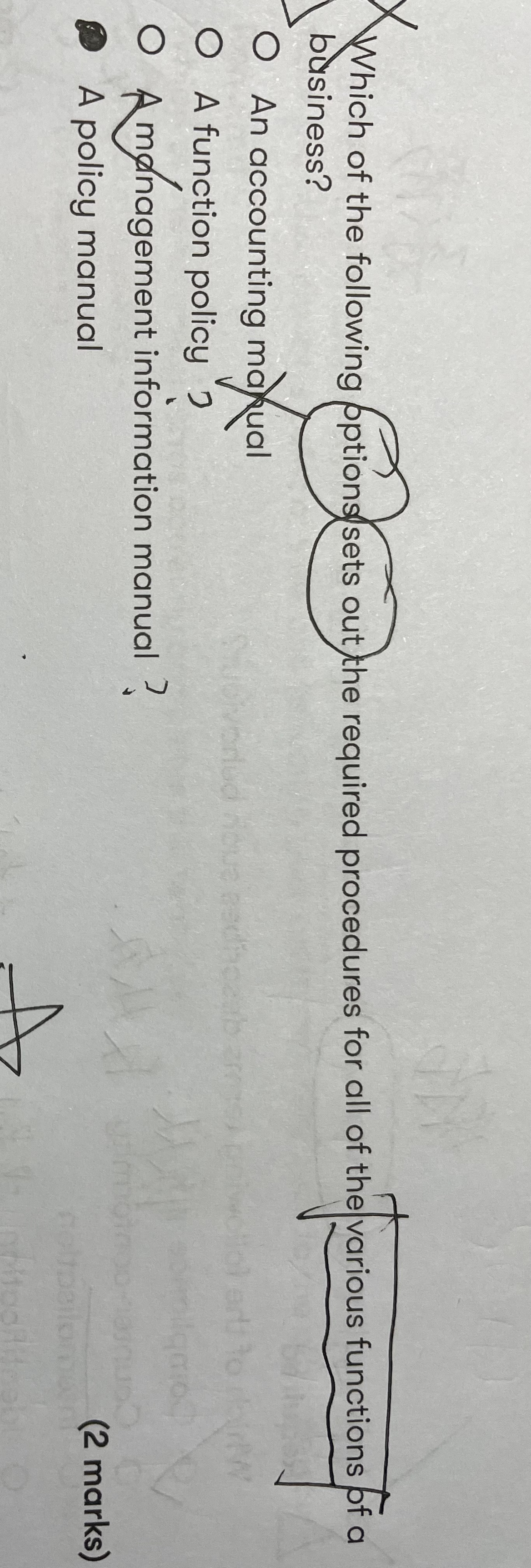 同学您好, 以下哪些选项列出了业务的所有功能所需的程序?那应该是政策手册吧 ,每个员工都应该阅读与职能相关的领域,政策手册应随时便于参考。function policy说的是政策职能,是出台政策的 相关机构所需要具备的标准规范性的行为。