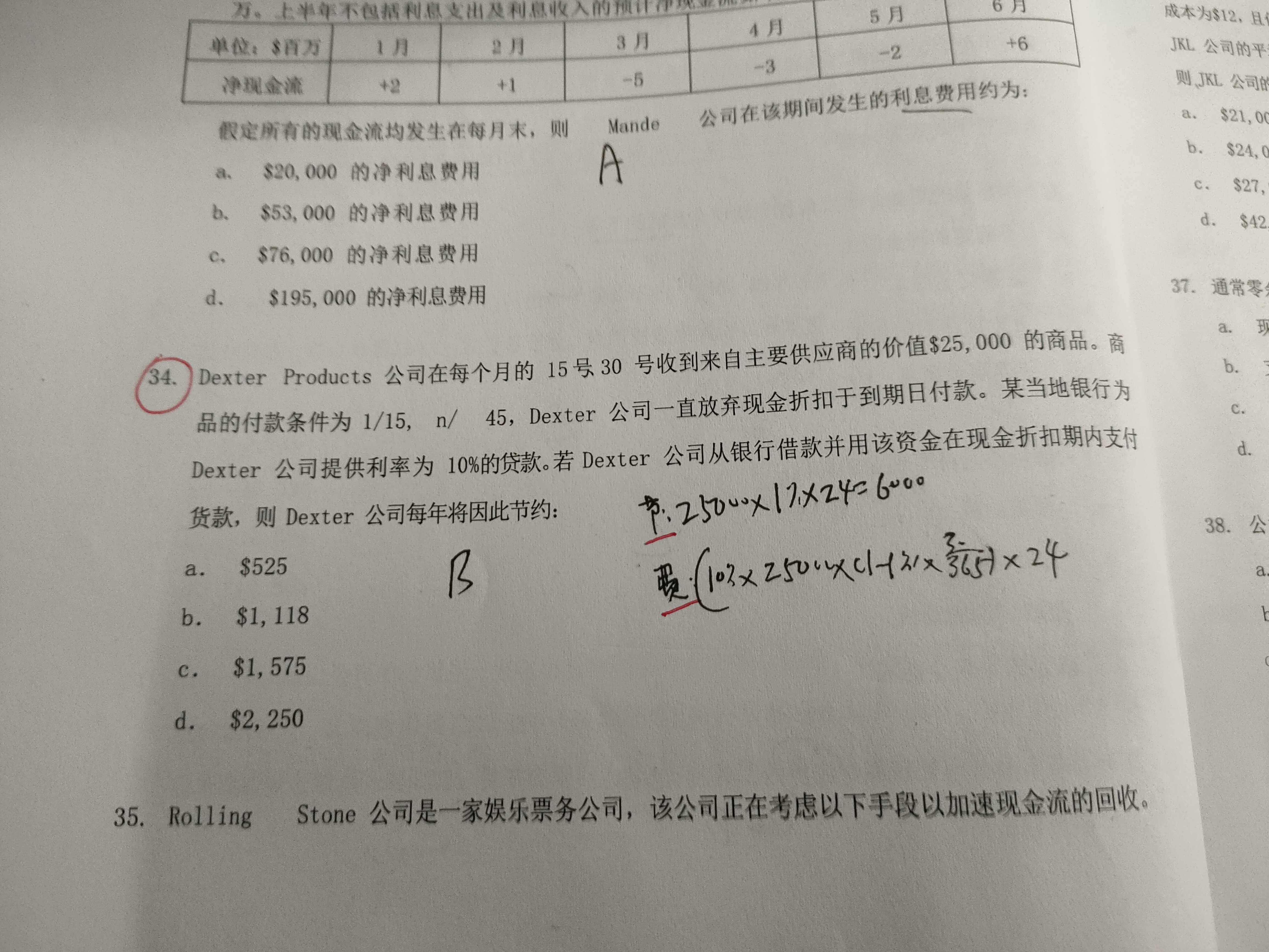 同学你好。这个题的做法大概是。先计算放弃现金折扣的的成本一年按照360天计算吧,(1%/1-1%)*360/(45-15)=大约12.12%,减去贷款的10%。就是节约的利息。2.12%还有在借款时,其实每次只需要50000就行周转使用。大约节省1100左右