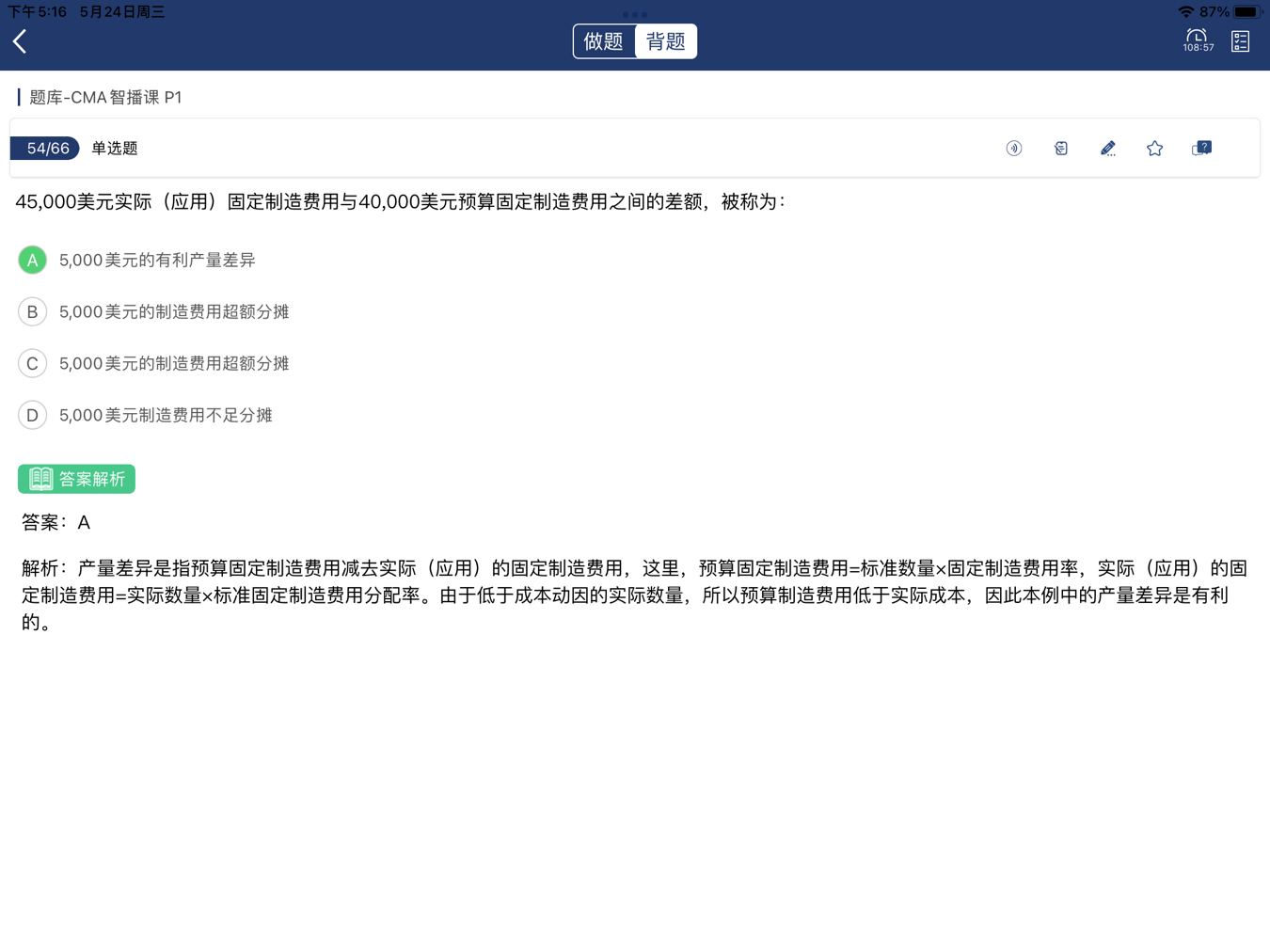 同学你好,(1)固定制造费用的产量差异是预算值-基于实际产量的分摊值。即(SQ-AQ)SP,当SQ*SP小于AQ*SP,说明实际产量高于预算产量,也就是说相同固定制造费用下,生产了更多的产品,所以是有利差异,反之,当SQ*SP小于AQ*SP,即SQ小于AQ,说明相同制造费用下,实际产量低于预算产量,是不利差异。(2)题目里面:预算固定制造费用是40000美元,基于实际产量的固定制造费用是45000美元,所以产生5000的有利差异。