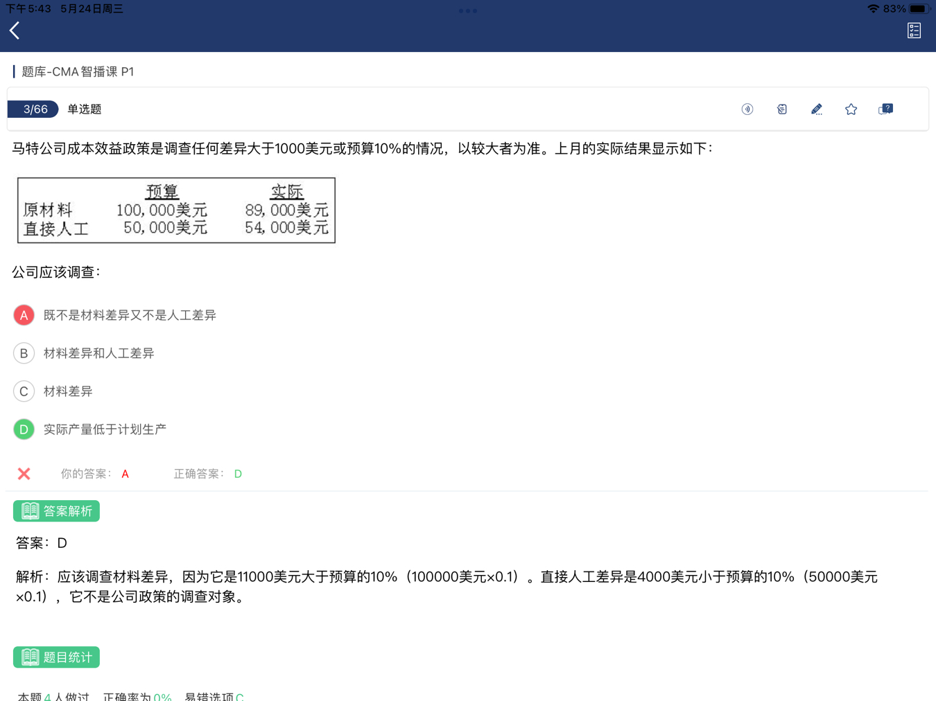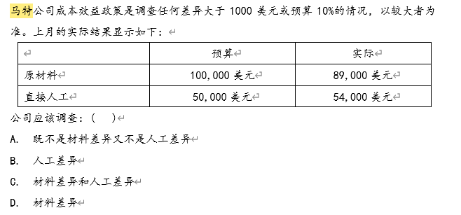 同学你好,由于工作人员的疏忽,题目选项答案上传错误,给您带来的不变深表歉意。完整题目如下图,所以公司应该调查的是原材料差异。