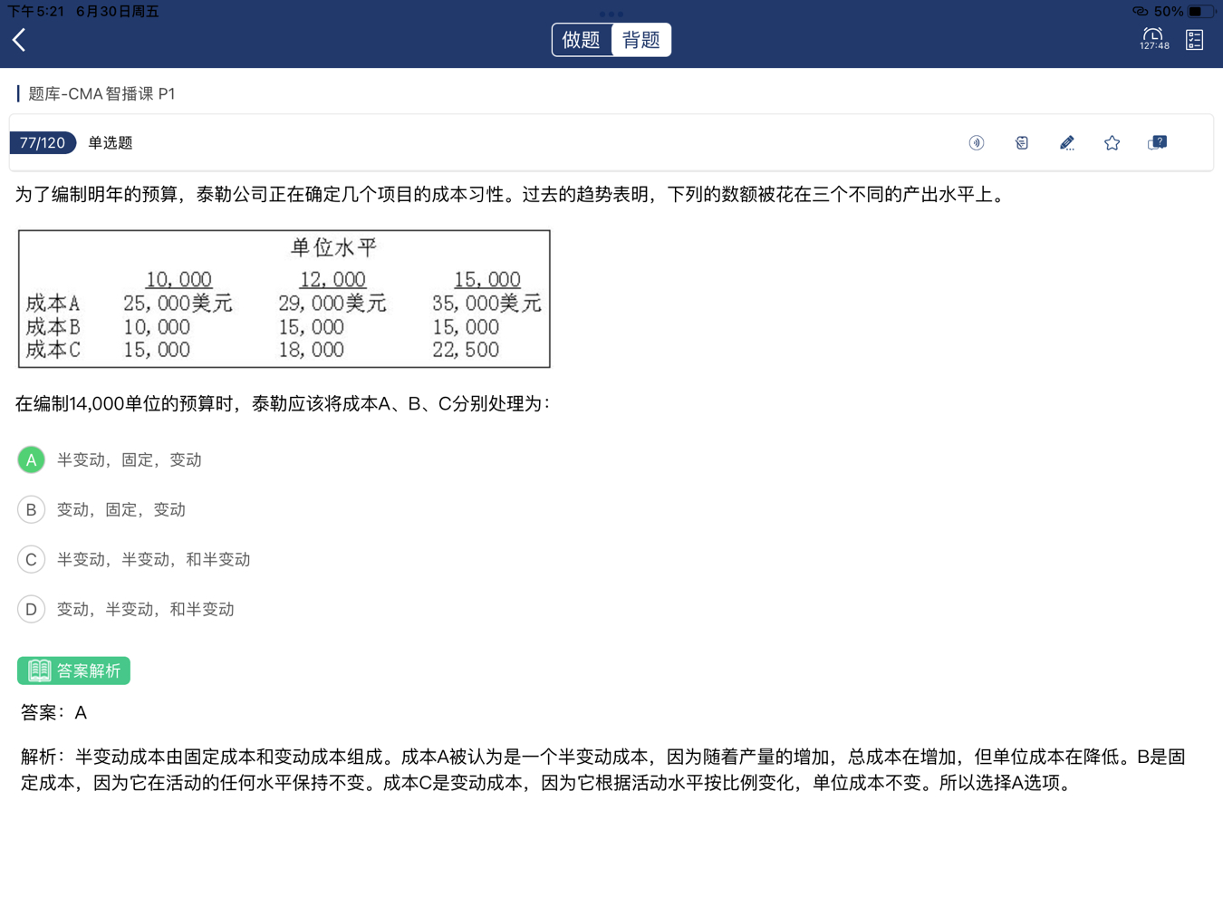 同学你好,在相关范围内,固定成本总额不随着产量变化而变化,单位变动成本保持不变。所以,B是固定,C是变动。但是A选项随着产量的变化,总产量在变化,且得到的比例不是固定数,也就是说产量单位与产量总额不成正比关系,所以是半变动。