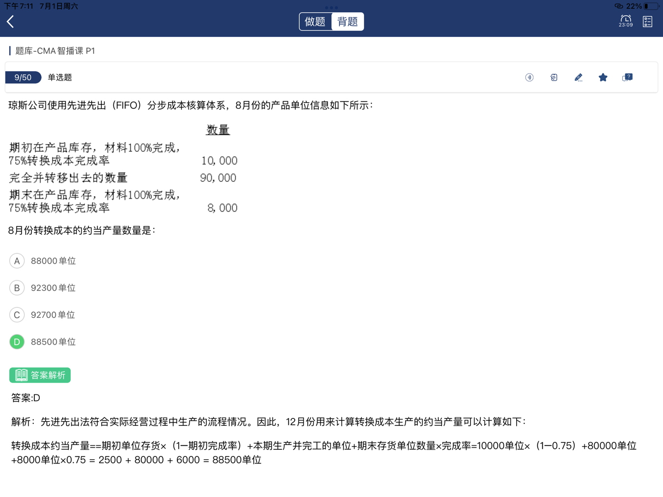 同学你好,(1)因为这道题目是先进先出法核算。且期初产品中的产品成本已经在期初进行了核算,所以在本期不再计入成本,只需要核算本期投入生产的部分,假设期初已完成20%,那本期就只需要再完成80%。同理:期末半产品的成本也在本期核算,而不是在下期核算,所以约当产量=×本期完成比率。在先进先出法把期初在产品存货量和本期投产、加工完成量分开处理。转换成本的单位成本=当期投入的转换成本/(当期完工数量+期末半成品库存的约当产量-期初存货×期初存货已完成百分比)(2)分步成本法下的先进先出法可以与加权平均法比较记忆。