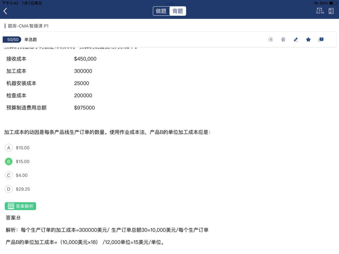 同学你好,(1)你问的是检查:A产品20,B产品30那里吗?这里不是生产总额。检查A产品需要花费20,检查B产品需要花费30.(2)这道题目里面,涉及到的数据是:加工成本的动因是每条产品线生产订单的数量;加工成本 300000;每条产品线的生产订单 A产品12,B产品18。(3)B产品加工成本=450000/(12+18)×18=180000(4)B产品数量共有12000件,所以单位产品B的单位加工成本应是=180000/12000=15
