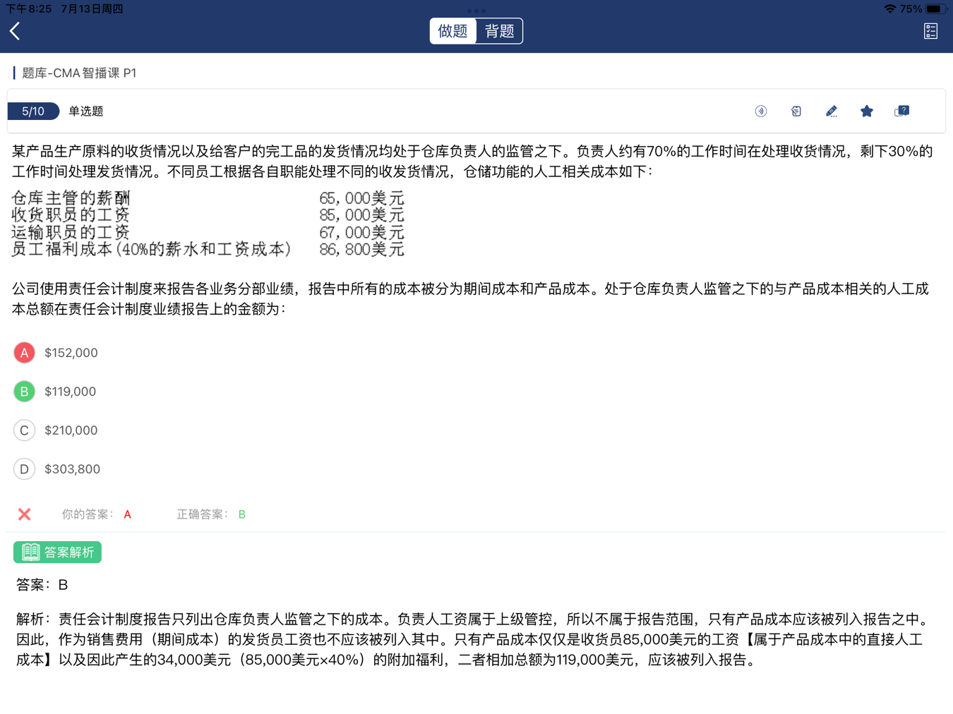 同学你好,这个员工福利成本86800,是上面几项工资之和的40%。但是题目中问的是,仓库负责人监管之下的与产品成本相关的人工成本总额,所以考虑的是收货人员的工资与福利金额。