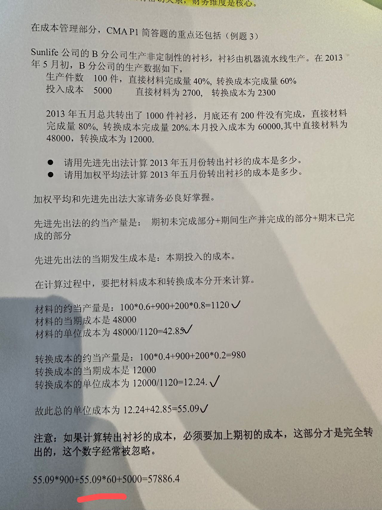 同学你好,请问一下这道题目来源是哪里呀?我个人认为答案错了:转出部分分为100单位期初投入本期完工+900本期投入本期完工。所以1000单位转出成本=(60+900)×42.25+(40+900)×12.24+5000。