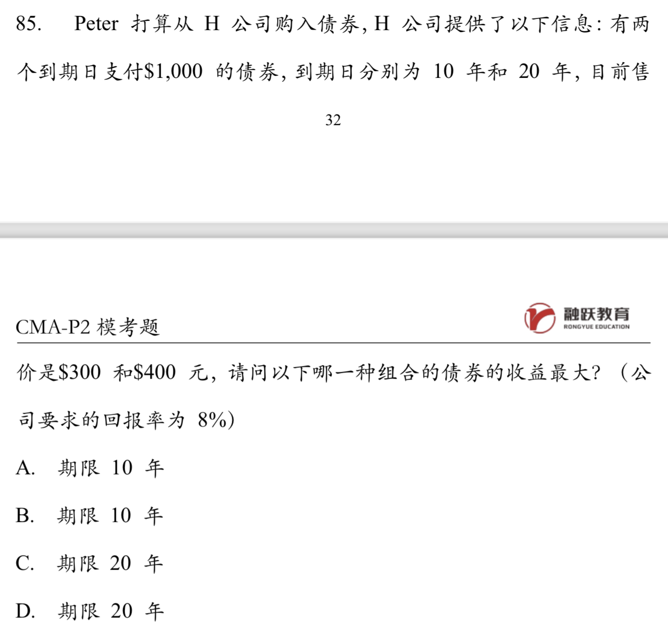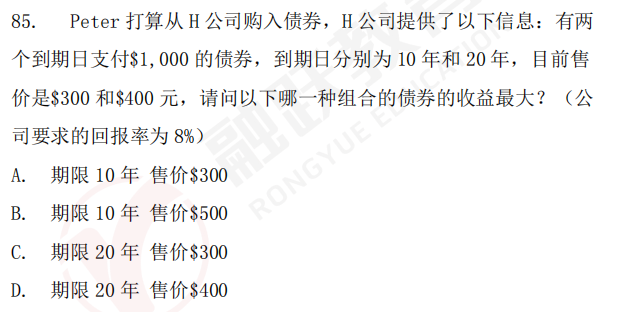 答:(1)题目修改如下图(2)这道题目计算的就是债券现值与现在售价相比,哪种组合收益最大。AB选项,折现率、到期日面值都相同,所以现在售价小的收益更大,所以A选项更多。CD选项同理,所以C选项大于D选项。AC选项,售价相同,到期日面值相同,但是折现率越大,折现出来的金额越小,所以A选项大于C选项,所以选择A选项。(3)另一种做法:可以利用复利现值系数一点点计算出来。