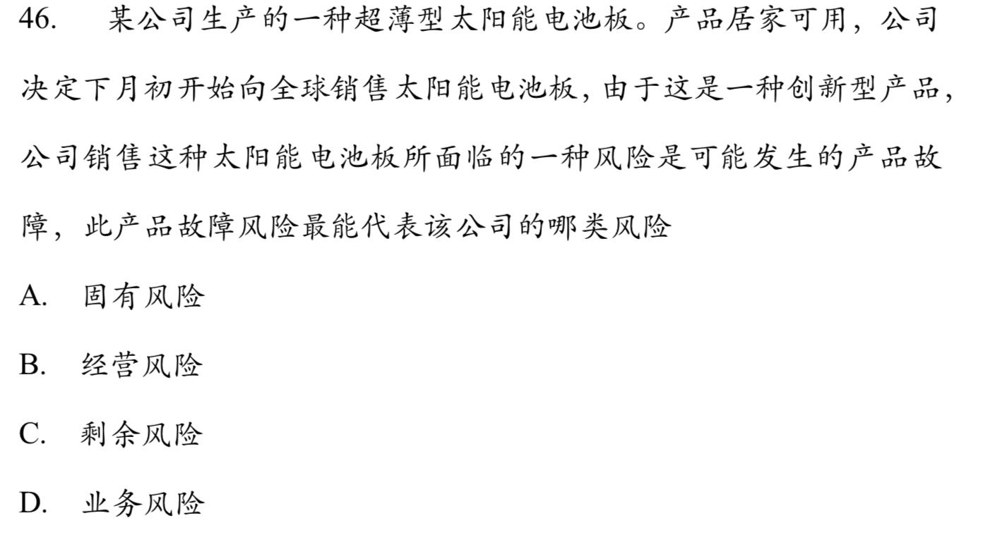 答:(1)固有风险:是指在考虑相关的内部控制之前,某类交易、账户余额或披露的某一认定易于发生错报( 该错报单独成连同其他错报可能是重大的)的可能性。固有风险独立于内部控制,是由某一事项等内在性质、外在环境等所决定的。(2)如果题干中提到“内部控制”,“内部控制未发现”等字眼的时候,可以往固有风险上考虑。而此题中提到的是可能会发生的产品故障,所以是跟日常经营相关的风险。