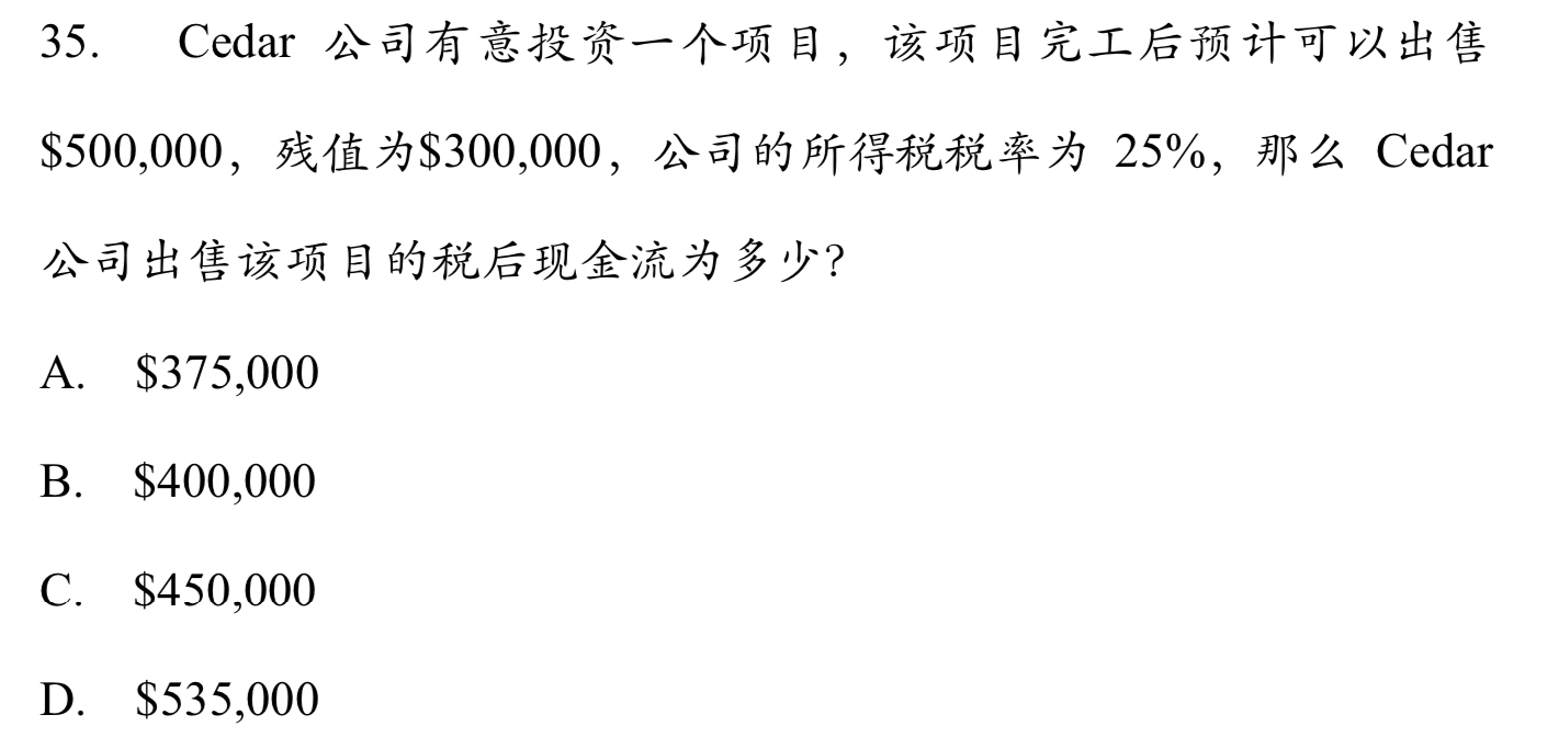 答:税后现金流=处置价格-(处置价格-账面价值)×税率=500000-(500000-300000)×25%=450000