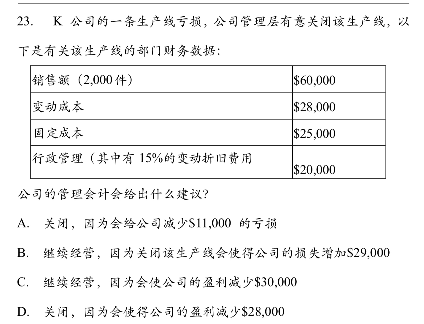 解析:继续运营的利润=60000-28000-25000-20000=-13000。不继续运营的成本=固定成本+行政管理的固定部分=25000+20000*0.85=42000。所以继续运营亏损成本更低,42000-13000=29000