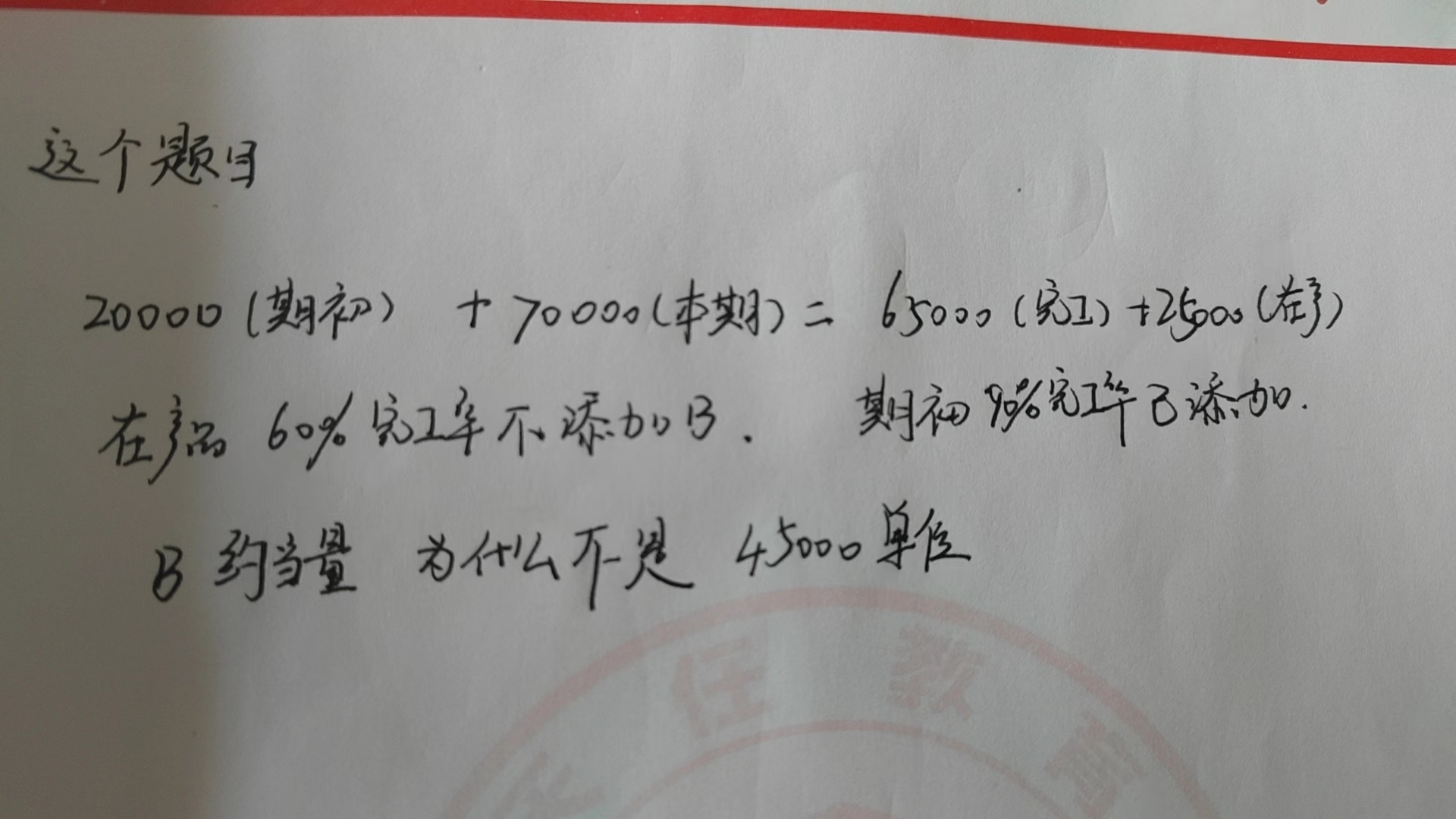 同学你好,首先根据期初存货+本期投入单位=本期转出+期末存货,根据题目信息可知,期初存货20000单位,本期生产70000单位,本期完工65000,所以期末存货25000。但又因为材料B是在产品生产80%的时候投入的,所以期末存货在完工率60%的时候,材料B还没有投入,所以投入材料的产品全部是已完工的65000,完工进度100%,所以约当产量=65000。