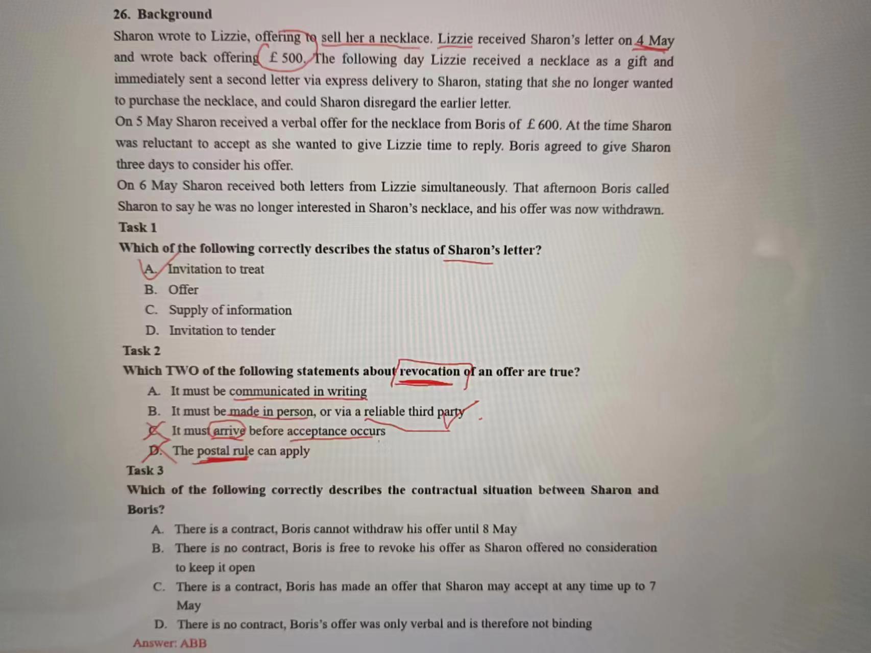 同学你好,这个题目选择B,C不选的原因是:revocation是需要在acceptance发生之前做出,而并非一定要到达。题设应该为:Which of the following.......