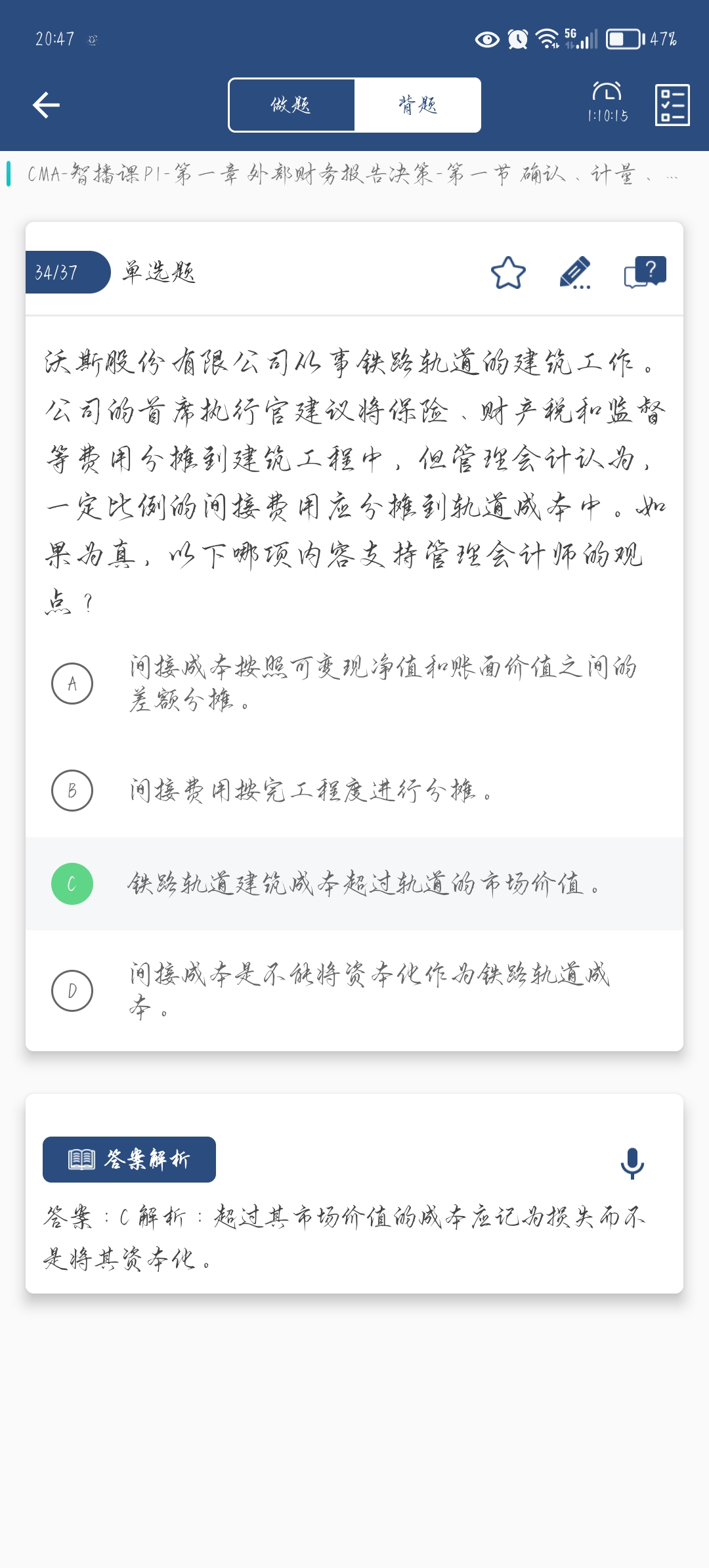 同学你好,题目中管理会计师的意思是一部分不是所有的间接费用都可以计入建筑成本,之后问原因。C选项的意思是:因为会计政策规定超过建筑成本市场价值的部分不能资本化,需要费用化,那超过的部分就不能分摊到轨道成本中。正好和管理会计师不能全部计入成本的观点一致。