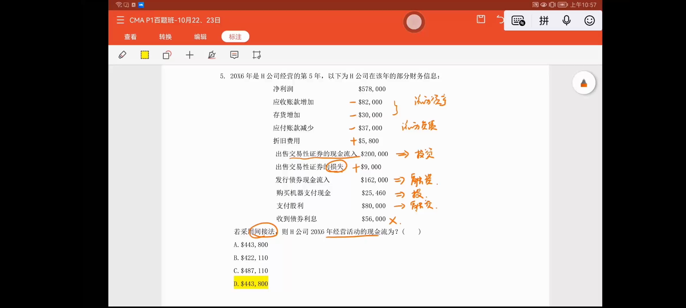 同学你好,因为题目中的问的是间接法编制经营活动现金流。出售交易性证券属于投资活动,所以它的利得与损失需要从净利润减去或加上