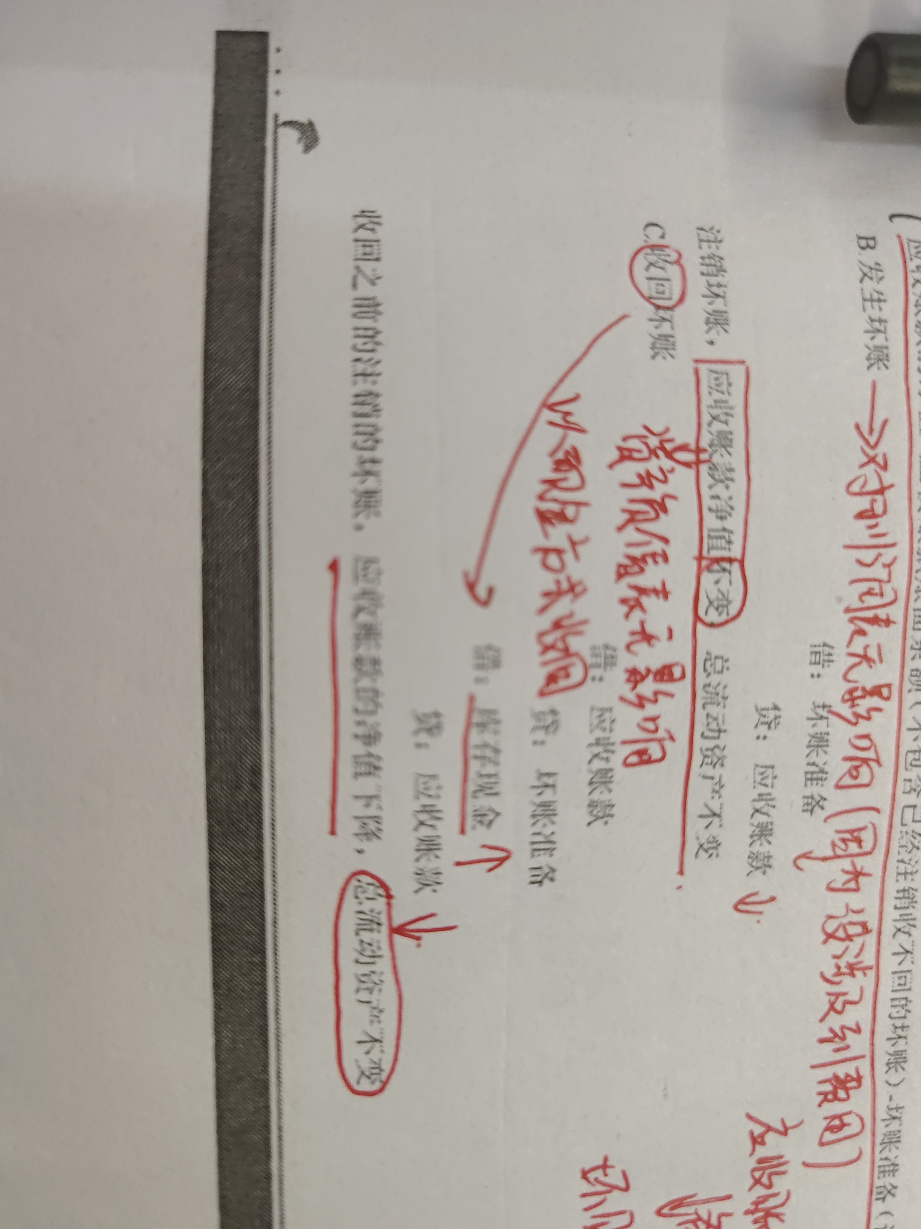 ①应收账款净值=应收账款-坏账准备(应收账款的备抵科目)。②但从C注销收回分录来看。借:应收账款 贷:坏账准备,属于应收账款内部的一增一减。应收账款与资产都没有变化。再来看下一个分录:借:库存现金 贷:应收账款,这个分录显示,应收账款减少,库存现金增多。但是属于流动资产的一增一减,总额不变。那再跟前面信息合并一起,就可以得到一个信息:应收账款减少了,库存现金增多,流动资产没有发生变化。③考试到这一步就结束了,但在实际中,你看关于这笔的金额多了“坏账准备”,所以后续会再做一笔会计分录 借:坏账准备 贷:资产减值损失