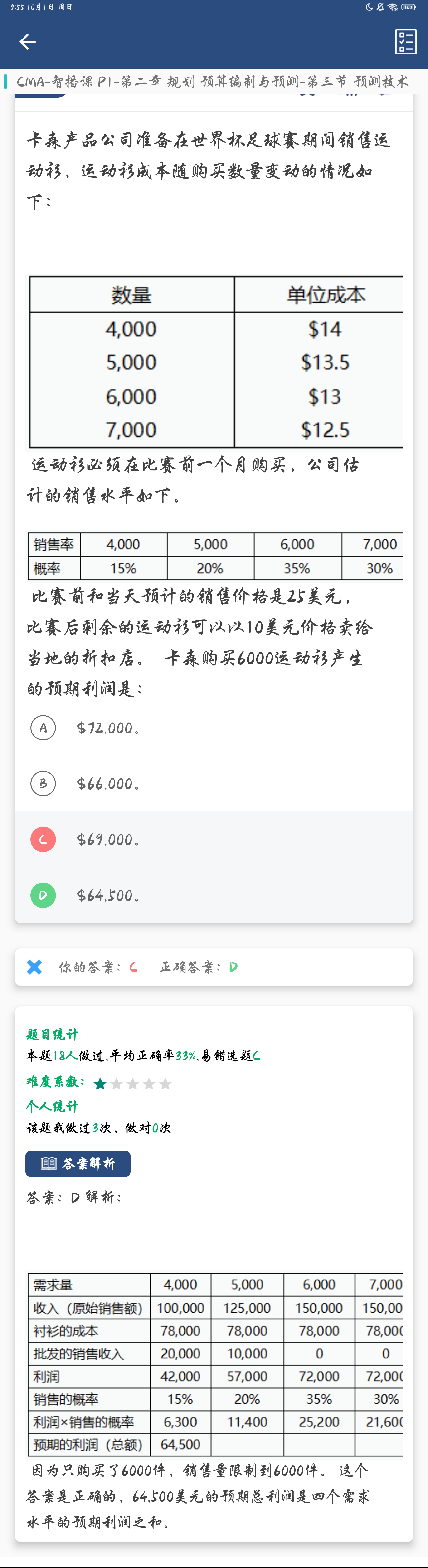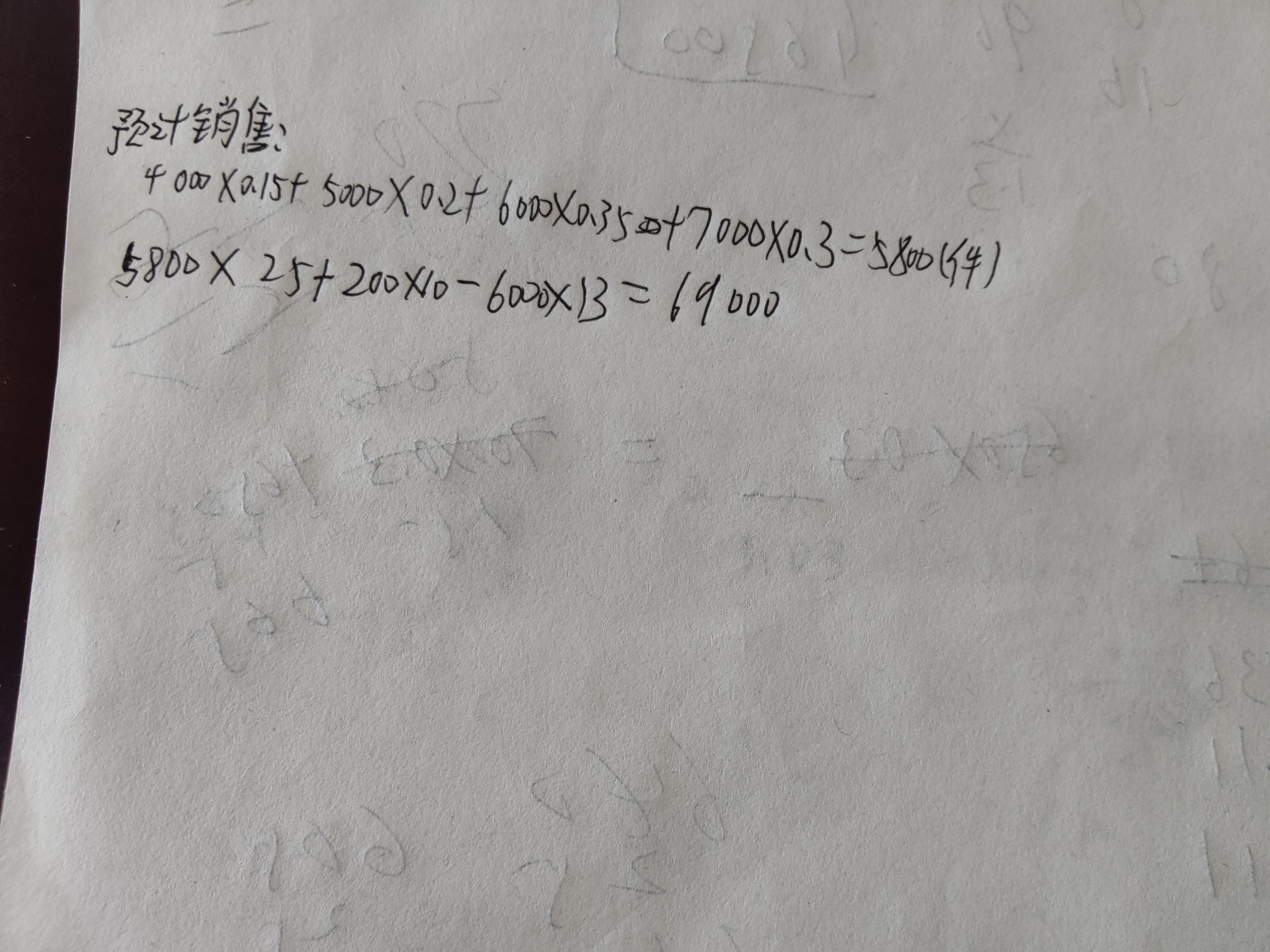 同学你好,因为卡森购买6000运动衫,所以在计算预期销售量的时候。到7000那块也应该是=6000×30%,最后预期可销售数量5500,未销售出去的是500。您再尝试计算一下