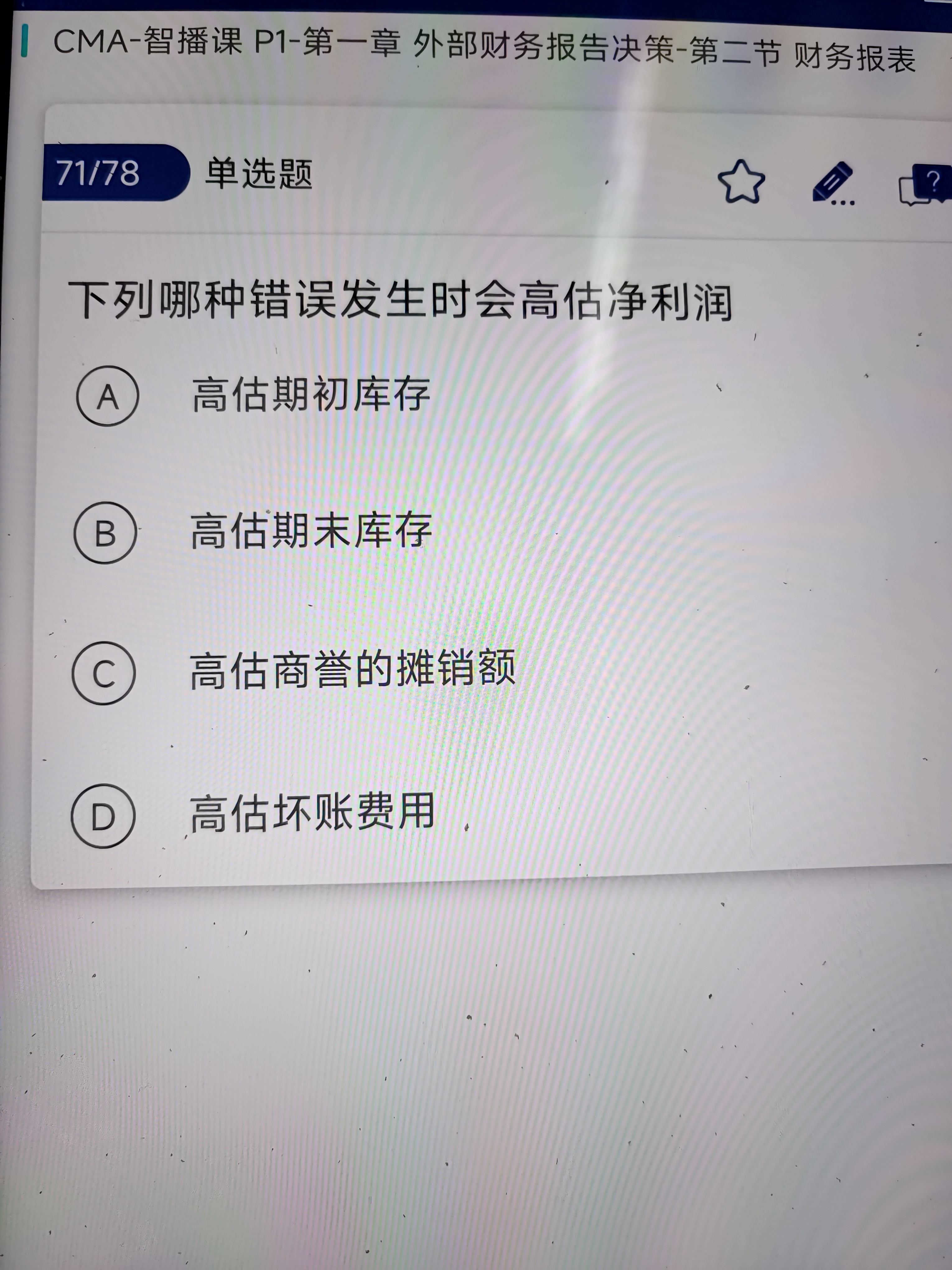 同学你好,首先我们需要知道存货的金额是固定的,在整个流转中,购入后的存货要么被销售,要么期末留存。期初存货+本期购入=期末存货+本期销售存货。期初存货和本期购入存货是正确估计的。如果高估了留存的金额,那本期销售部分的存货价值就会低估。销售的存货在利润表里是主营业务成本,那也就是主营业务成本被低估,净利润=营业收入-营业成本-销售费用-......。被减项小了,所以净利润就会被高估。