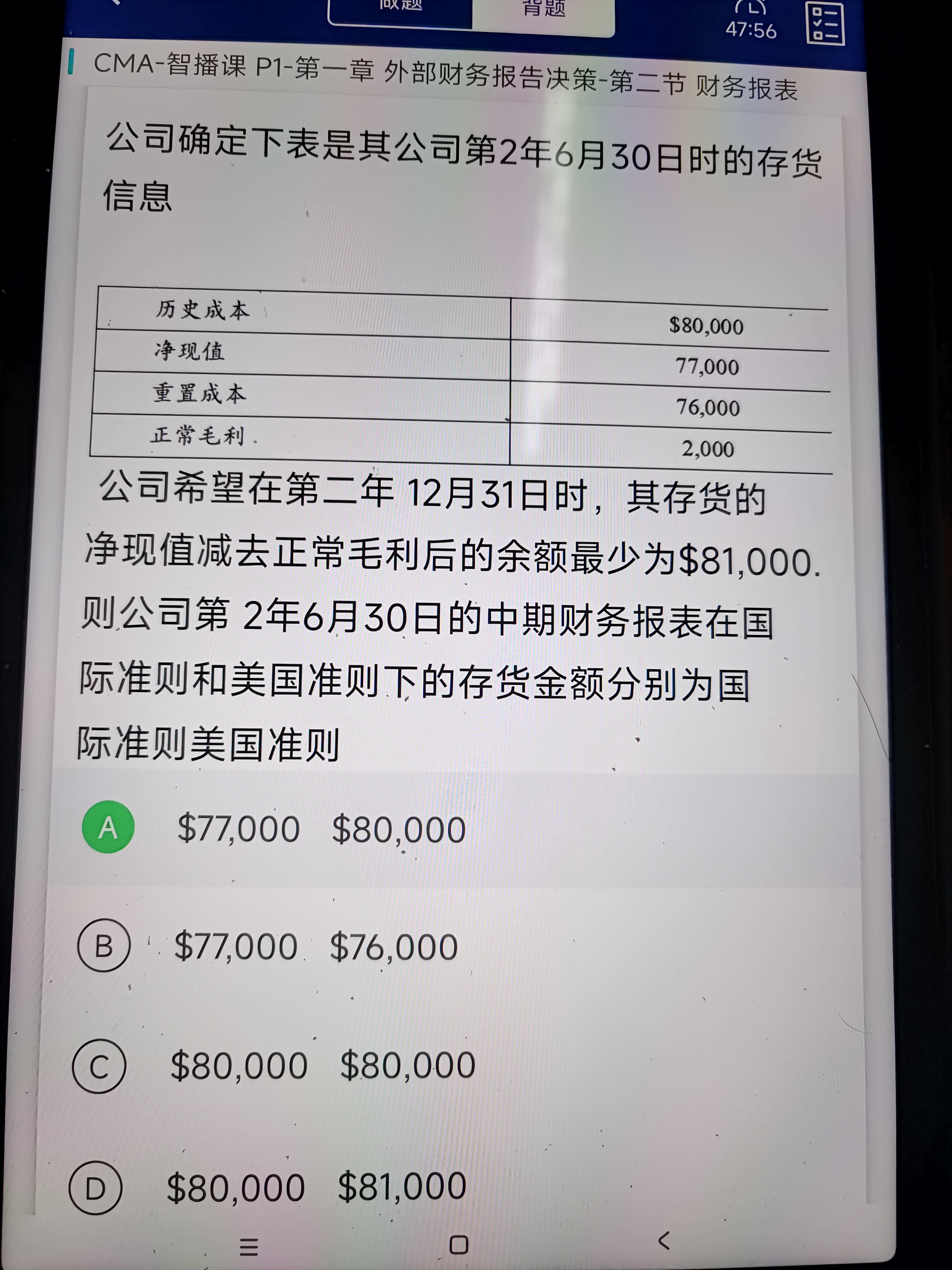 同学你好,1、如果题目中没有给当期购入存货的批次、金额等信息,就说明不是考察存货先进先出还是后进先出的问题。2、这个是存货老准则的题目:“成本与市价孰低原则。准则中把市价定义为基于当前存货效用下的重置成本。但是关于这个重置成本有两个限额:①最高限额——市价不能高于存货的可变现净值。②最低限额—市价不能低于存货可变现净值减去正常加价或毛利折让后的金额。因为题目中给了一个关于12.31日的信息是:其存货的净现值减去正常毛利后的余额最少为$81,000。那也就是说这个重置成本最低是81000。这里的历史成本是80000,所以成本与市价孰低原则,选择相对较低的成本80000