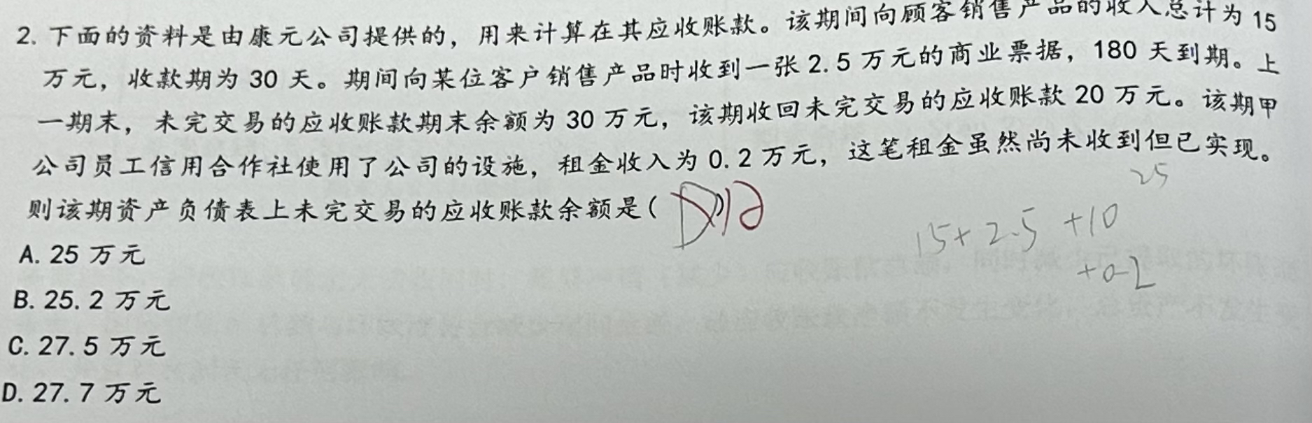 同学你好,①可否告知这道题目的来源,觉得有些许问题。②尚未收到但以实现:交易已经完成,但还没有收到相应的款项。③商业票据记在应收票据科目,而不是应收账款。④员工信用合作社这里存在争议,可以理解为内部交易,内部交易的话,在合并层面收入抵消。