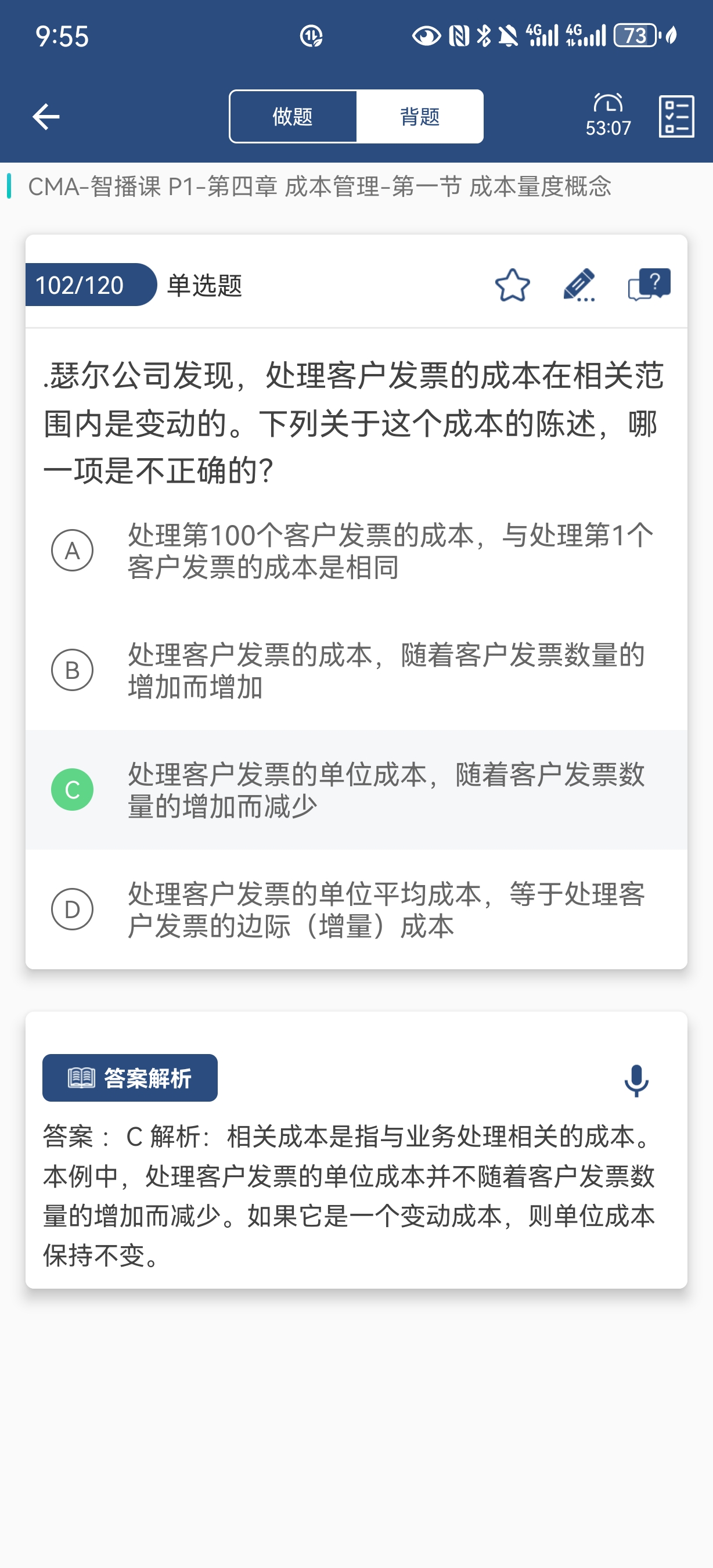 同学你好,因为题目中让选择的是不正确的呀。C选项说的是单位成本变化,所有不对。