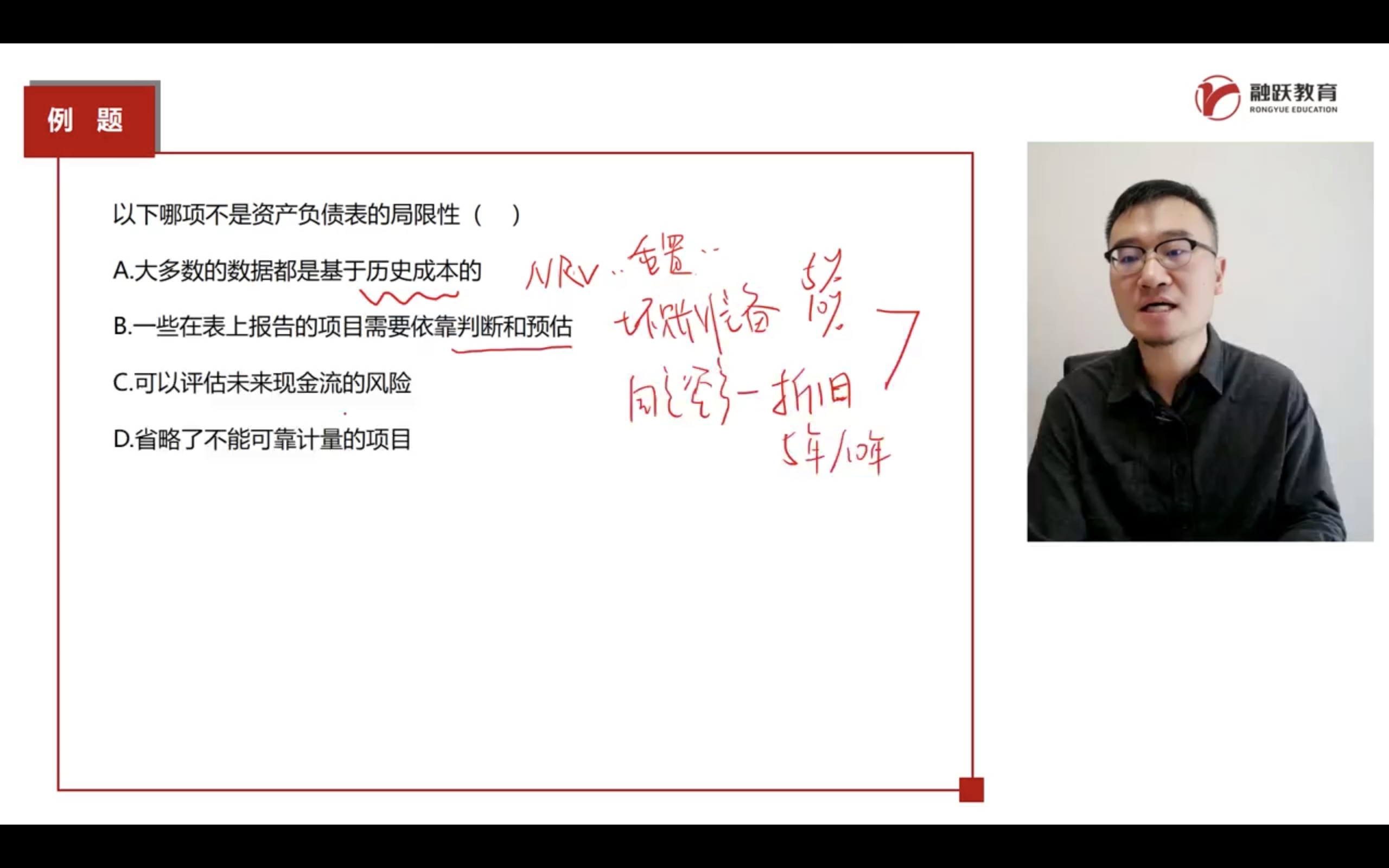 同学你好,①因为资产负债表的数据都是过去一段时间的数据,它不反映资产、负债和所有者权益的现行市场价值,这里就是其中一项局限性。②C选项错在跟题目无关。利润是形成企业经营活动现金流的主要来源,是举债企业偿还债务的重要保障。比如:间接法编制经营活动现金流就是从净利润出发。