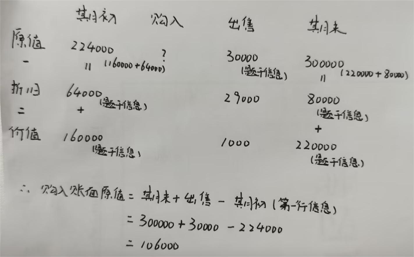 同学你好,①首先:固定资产账面原值-固定资产折旧=固定资产账面价值。②其次:期初固定资产金额+当期购入固定资产金额=当初出售的固定资产金额+期末固定资产金额。(从账面原值、折旧、账面价值三个角度都是)③题目信息给出信息出售资产的账面原值为30000(第二行),所以这个就是解析里面出售账面原值30000。④如果您哪里还不明白,可以具体问哦~