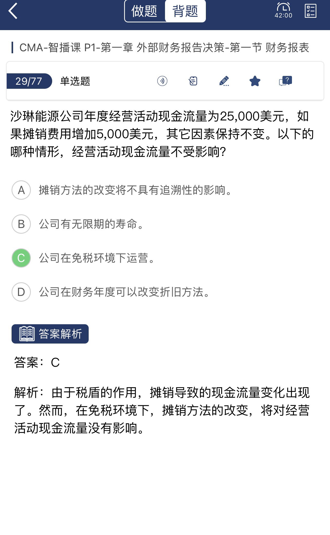 同学你好,①摊销金额的增加,并没有现金流的支出。但是在税收环境下,摊销费用增加5000美元,假设此时税率为25%,那也就意味着可以少交税额=5000×25%=1250美元,所以现金流会增加1250美元。因为摊销费用的增加,减少了净利润,从而导致少交税。②在免税环境下,摊销费用本身同样不造成现金流的减少,又没有税收,会减少净利润,但不会减少所得税的减少,所以间接也不会造成现金流的减少。