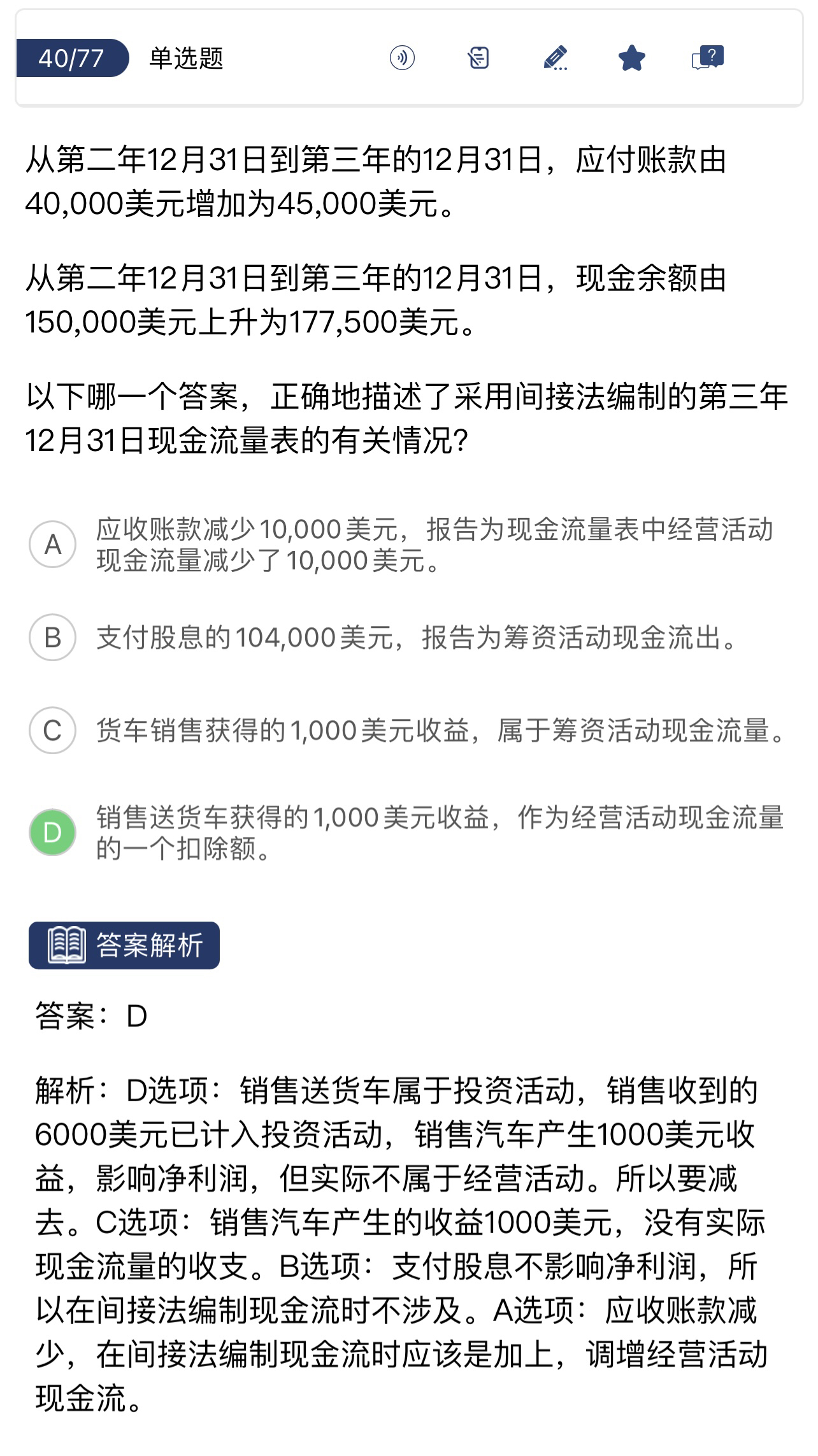 ①货车属于固定资产,销售货车属于投资活动。②C选项的,1000元收益属于损益类,不是实际的现金流量收入,属于投资活动的现金流入,应该是销售这辆车的全部收到的款项。