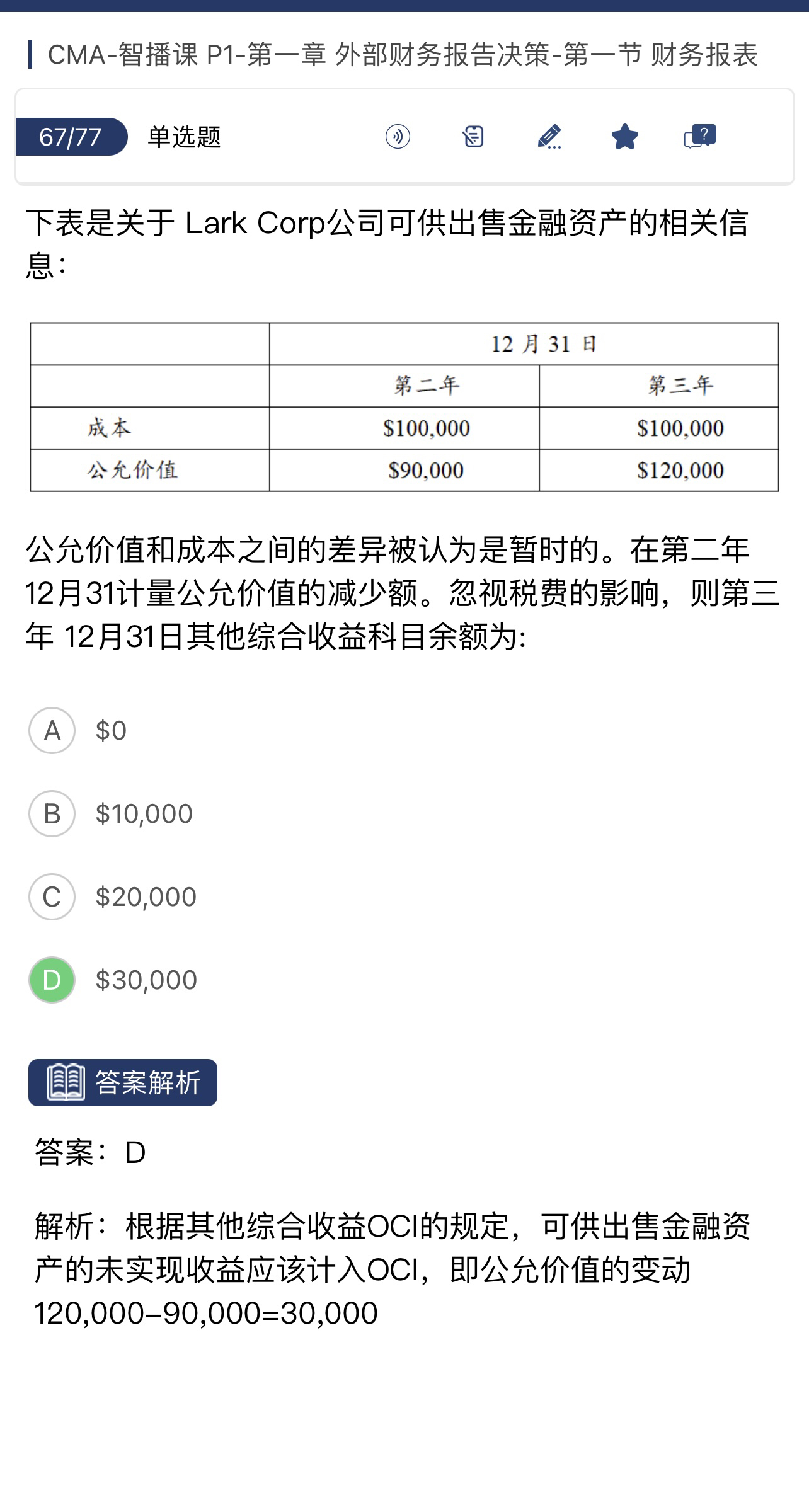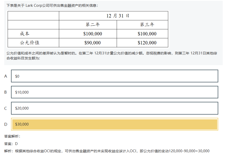 同学你好,“可供出售金融资产”类的资产组合按照公允价值计量,在资产负债表日由于价格波动导致的未实现的利得或损失计入其他综合收益。在第二年末的时候,其他综合收益的期末余额为=90000-100000=-10000,在第三年末的时候,其他综合收益的期末余额=120000-100000=20000,所以本期 其他综合收益科目变动的金额=20000-(-10000)=30000