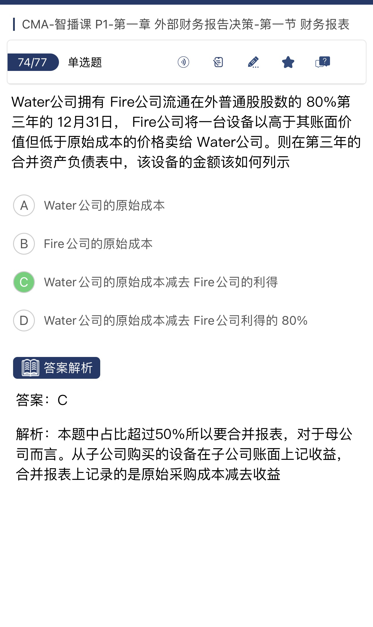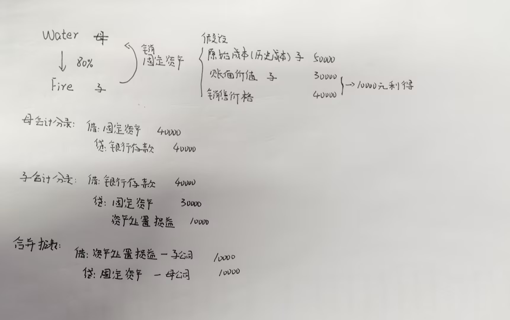 同学你好,整体思路如下图。因为Water持有Fire公司80%的股权,所以Fire是Water公司的子公司。子公司销售给母公司固定资产,产生的利得,在合并层面是要抵消掉的,是为了防止母子公司之间为了虚增收益等问题。在合并层面上,固定资产的账面价值不发生变化。所以用到是母公司的购买价格减去子公司销售账面上产生的利得。