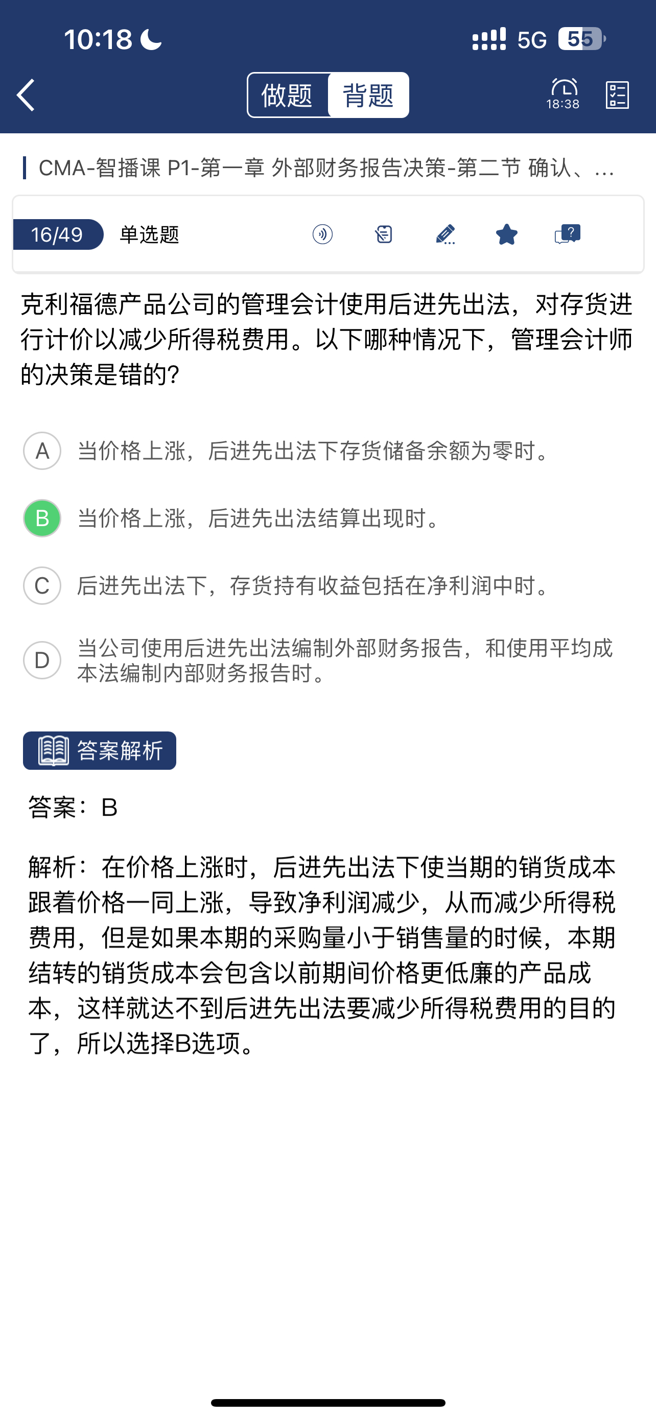 同学你好,①价格上涨,销售量大于本期购进数量,先购进的存货成本较低,所以后进先出法下净利润会高,所得税金额也会高,所以B选项错误。②当A选项,期初存货数量为零,使用不到期初存货,本期存货成本高,当期净利润减少,所以所得税费用低,符合管理会计的判断。③C选项 ,由于题干中没有说价格上涨还是价格下跌,所以,存货的持有收益存在不确定性,当价格上涨时,存货的持有成本上升,利润 增加;相反,当价格下降时,存货的持有成本下降,利润减少。所得税费用存在不确定性。不能判断管理会计师对错。④D选项,没有说价格上涨还是价格下跌,所以公司使用后进先出法编制外部财务报告,利润存在不确定性,所得税费用也存在不确定性