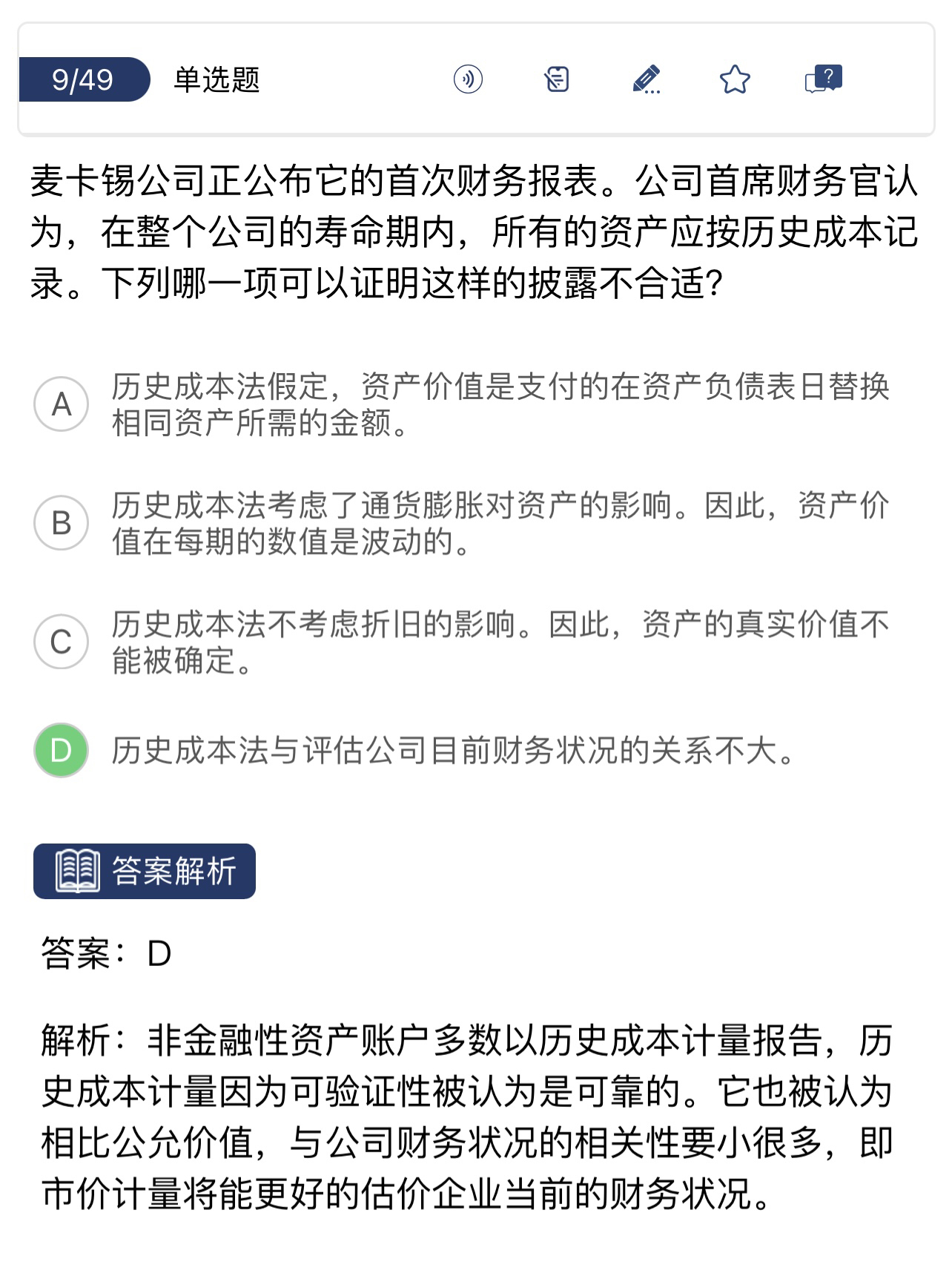 同学你好,历史成本法考虑折旧。历史成本指的是以购买时候的价值入账,按照资产的消耗方式进行折旧。但C选项的后半句是对的,资产的现在价值无法通过历史成本法体现。