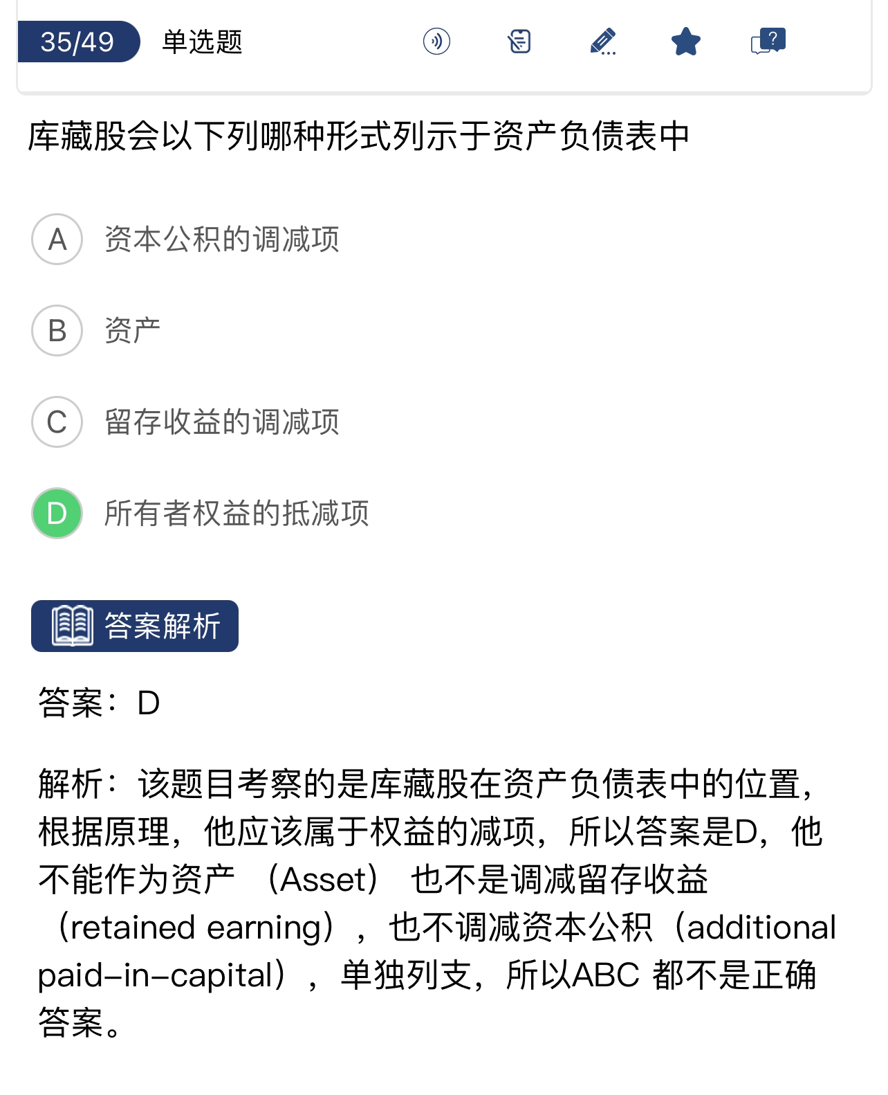 同学你好,库存股是公司管理层从资本市场购入的在一定时间内持续持有的本公司股票。从资本市场购入本公司股票的行为称为“股票回购”。股票从回购以后到注销或者奖励给员工之前这个时期,就形成了库存股。库存股不是公司的一项资产,而是所有者的权益。企业收购公司股份时的分录是,借:库存股,贷:银行存款。或者可以理解为是股本的备抵科目。